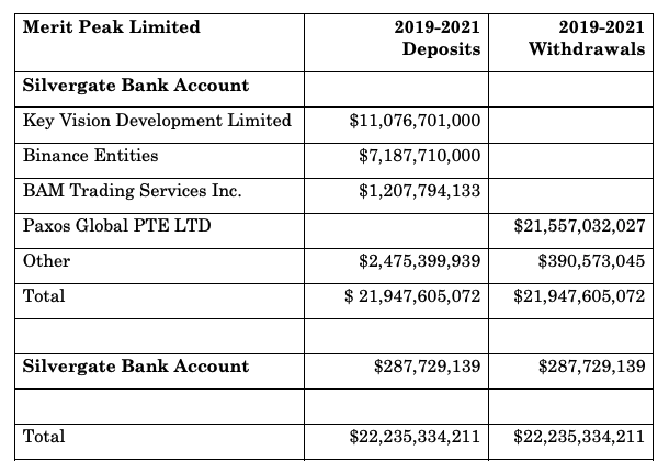 Pada periode tahun 2019 hingga 2021, Merit Peak menerima total deposit US$22,23 miliar. Dalam periode itu, terjadi penarikan dengan angka yang sama pada deposit. Adapun senilai US$21,55 miliar di Merit Peak mengalir ke Paxos.