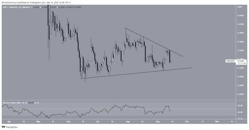 Terlepas dari adanya sinyal bullish pada grafik XRP dengan time frame mingguan, terkait seperti apa aksi harga pada time frame hariannya masih menjadi misteri. Fakta bahwa harga XRP saat ini diperdagangkan dalam segitiga simetris (symmetrical triangle) adalah penjelasan pertama untuk hal ini. Pasalnya, segitiga simetris dianggap sebagai pola yang netral. Artinya, kedua aksi breakout dan breakdown masih mungkin terjadi.