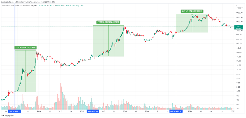 - sementara saat ini, setelah halving ketiga dalam siklus 2020-2024, adalah 929 dari 1428 hari, yaitu pada 26 November 2022 – harga BTC saat ini adalah US$16.500.