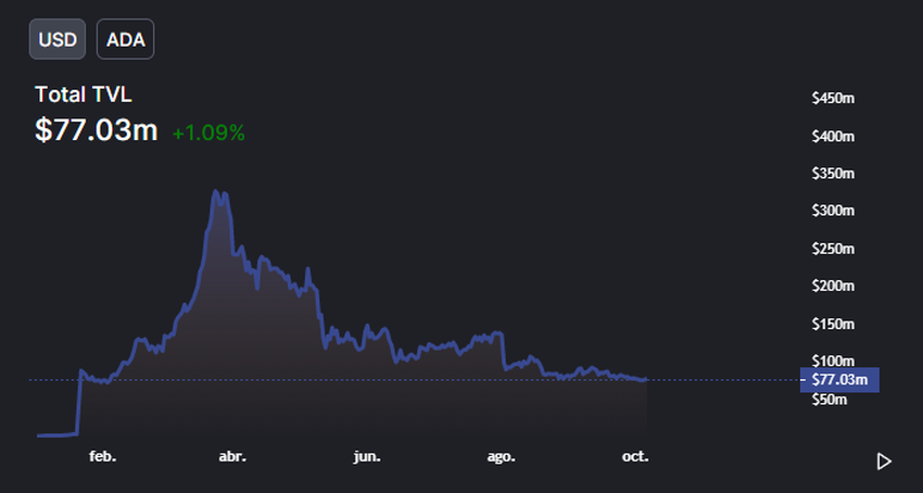 Salah satu dari antara jaringan berkonsensus PoS adalah Cardano. Proyek blockchain ini merupakan karya dari Charles Hoskinson. Pada masa puncaknya di Maret tahun ini, jaringan buatan co-founder Ethereum itu sanggup menorehkan pencapaian TVL sebanyak US$326 juta. Namun, angka tersebut akhirnya menyusut 76% di bulan Oktober, dan kini hanya menjadi US$77 juta.