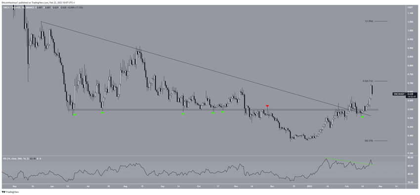 Harga 1INCH sendiri sudah ambruk di bawah garis descending resistance sejak Mei 2022. Penurunan tersebut menyebabkan terbentuknya level terendah US$0,36 pada 16 Desember. Namun kemudian, harganya mengalami trend reversal dan sudah naik lagi sejak saat itu. Akhirnya, aksi kenaikan harganya itu juga sukses menembus garis resistance serta area resistance US$0,55 pada 3 Februari. Setelah itu, harga 1INCH mencapai level tertinggi US$0,70 pada 21 Februari. Uniknya, level tertinggi itu terbentuk sangat dekat dengan level retracement resistance 0,5 Fib di angka US$0,71.