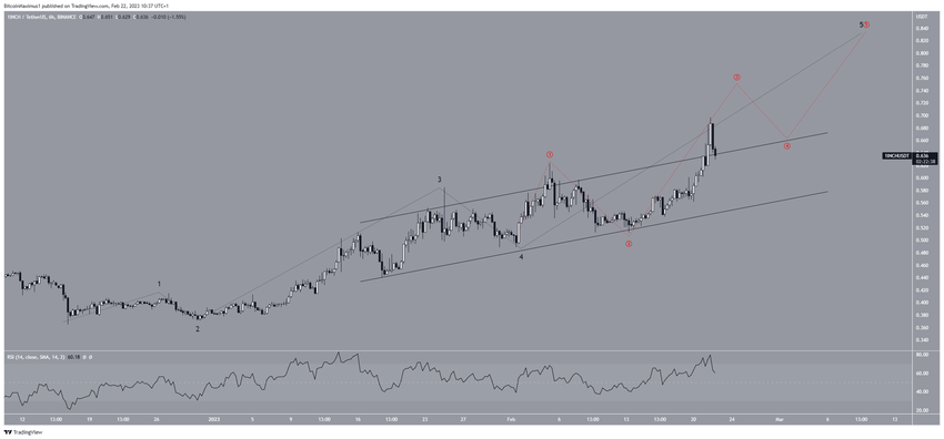 Pertama, indikator wave count menunjukkan bahwa harga 1INCH kini sedang berada di gelombang kelima dan terakhir dari kenaikan tersebut (hitam). Gelombang ini sudah memanjang, yang dibuktikan dengan kehadiran sub-wave count (merah).