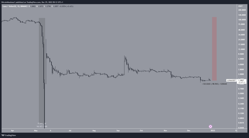 Sejak crash besar-besaran tersebut (disorot), LUNA sempat memantul sedikit dan saat ini diperdagangkan pada harga US$1,30. Meski begitu, harganya masih 99% di bawah harga tertingginya sepanjang masa di level US$119,6. Selain itu, tidak ada titik support di bawah harga saat ini, sehingga ada potensi terjadinya keruntuhan.
