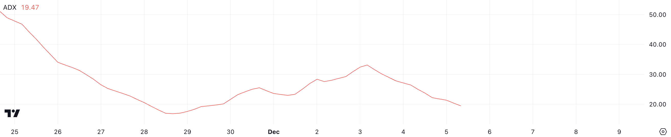 Cardano ADX telah turun ke 19,4 dari 33 pada 3 Desember, menandakan tren yang melemah. Penurunan ini menunjukkan bahwa kekuatan tren naik ADA baru-baru ini memudar, meskipun harga tetap dalam jalur naik. Antara 1 Desember dan 3 Desember, harga ADA melonjak hampir 27%, yang sejalan dengan ADX-nya mencapai 33.