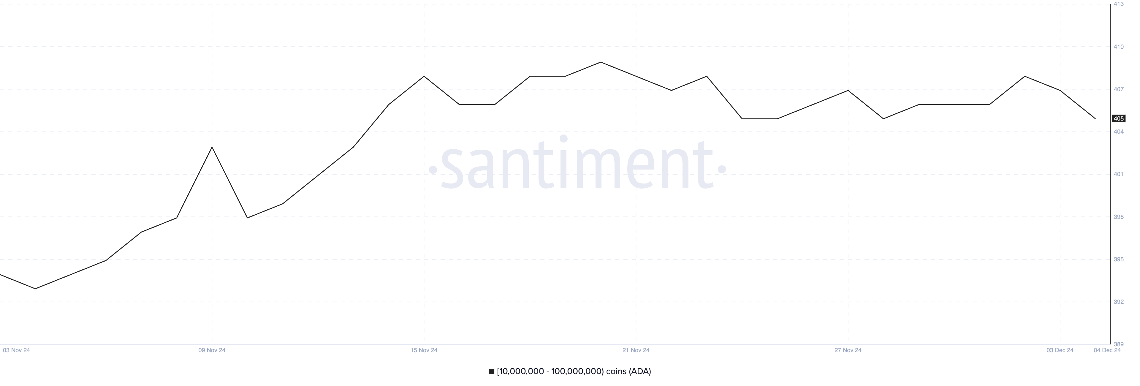 Jumlah alamat yang memegang antara 10 juta dan 100 juta ADA mengalami pertumbuhan signifikan pada awal November, meningkat dari 393 pada 4 November menjadi 409 pada 20 November.