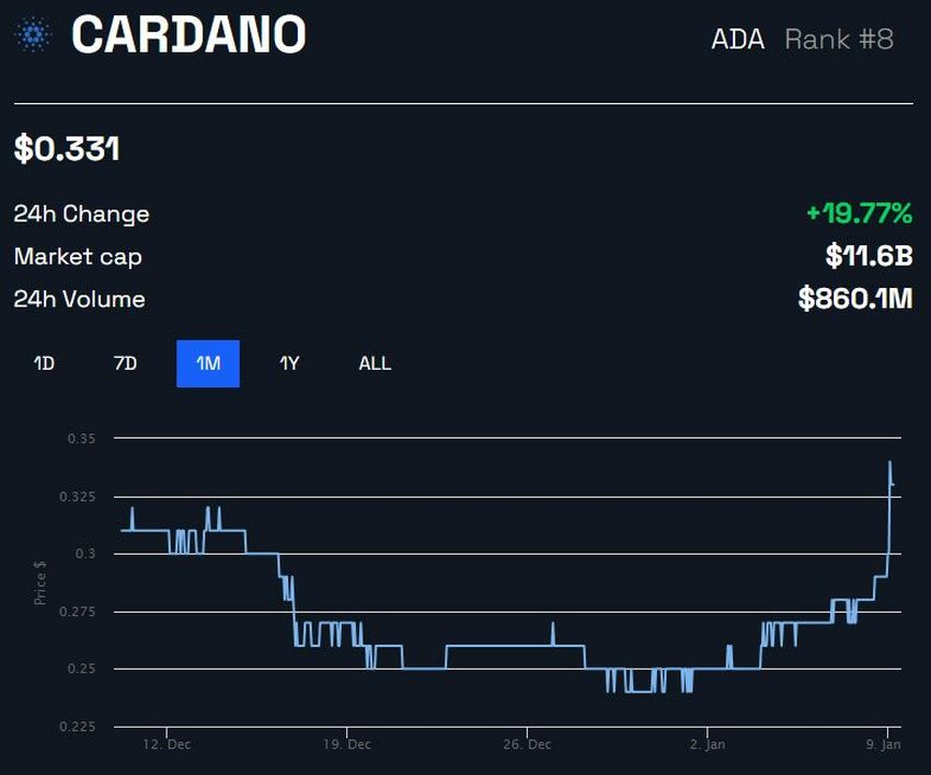SponsoredHarga ADA sendiri telah meroket sebanyak 20% selama 24 jam terakhir, menjadikannya salah satu pemain terbaik hari itu. Akibatnya, pada saat publikasi, ADA telah berhasil mencapai harga tertinggi sejak pertengahan November di US$0,331.