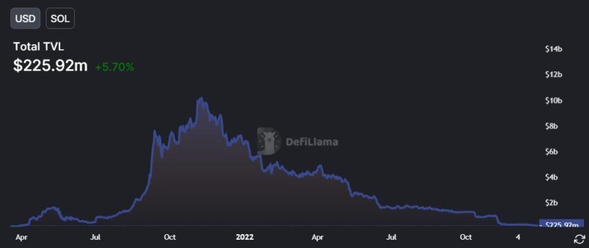 Pada tahun lalu, harga Solana tercatat telah mengalami penurunan lebih dari 94% di CoinGecko. Selain itu, menurut data dari DeFiLlama, TVL ekosistem ini juga sudah terpangkas menjadi US$225 juta. Jumlah ini mencerminkan aksi turun besar-besaran pada TVL-nya yang tercatat sempat mencetak angka US$10 miliar pada November 2021.