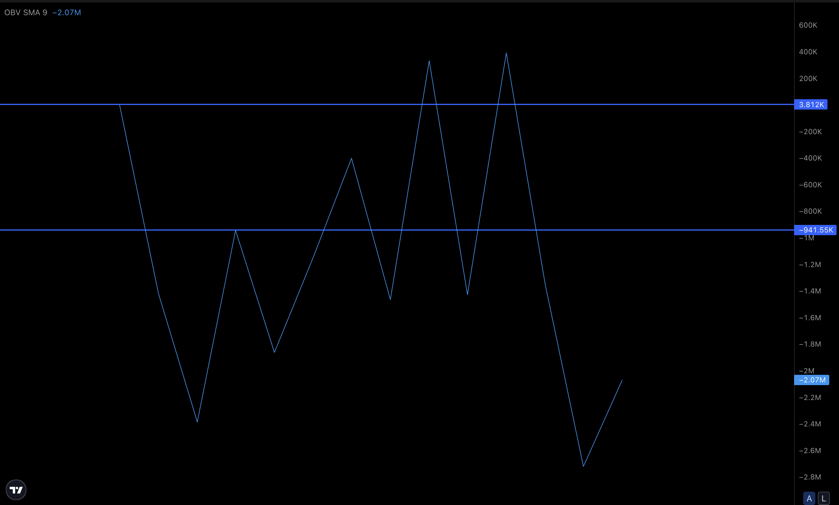 Garis On-Balance Volume (OBV), yang melacak pembelian dan penjualan kumulatif, menunjukkan zigzag serupa. OBV jatuh tajam setelah peluncuran tetapi sekarang mencoba untuk berbalik naik lagi. Jika OBV dapat kembali ke arah netral, ini akan mengonfirmasi bahwa pembeli secara bertahap menyerap tekanan jual di AsterDEX.