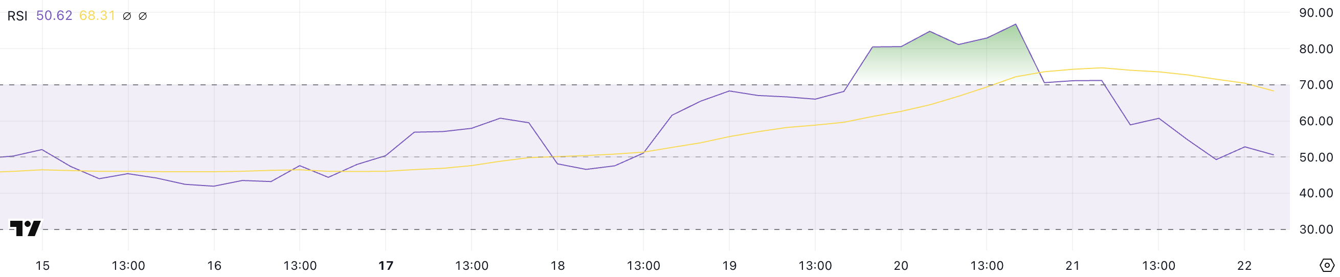 Ini biasanya digunakan untuk mengidentifikasi kondisi overbought atau oversold, dengan nilai di atas 70 menunjukkan level overbought dan di bawah 30 menunjukkan wilayah oversold.