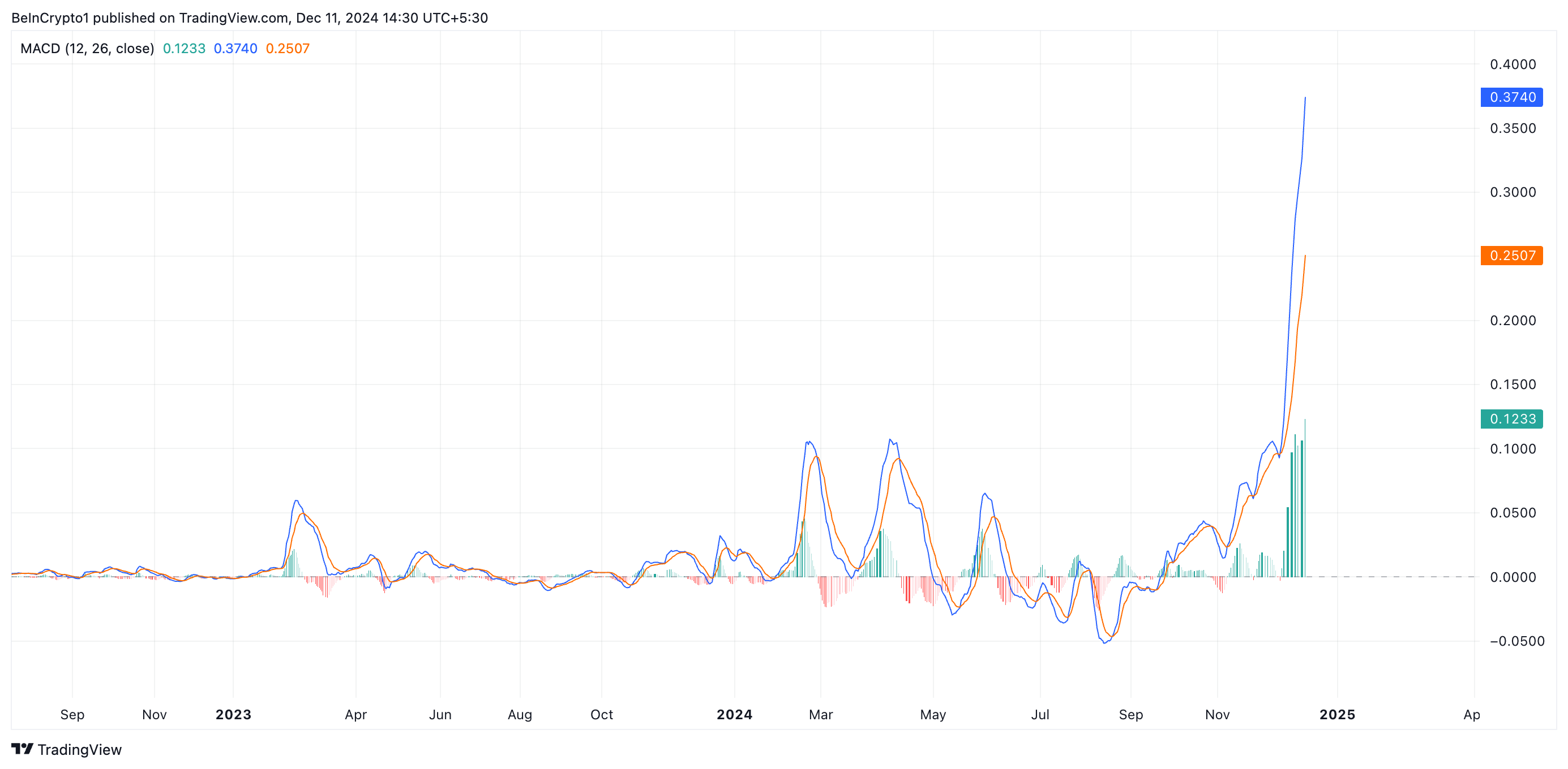 Moving Average Convergence Divergence (MACD) BGB mendukung pandangan bullish ini. Pada waktu publikasi, garis MACD token (biru) berada jauh di atas garis sinyalnya (oranye).