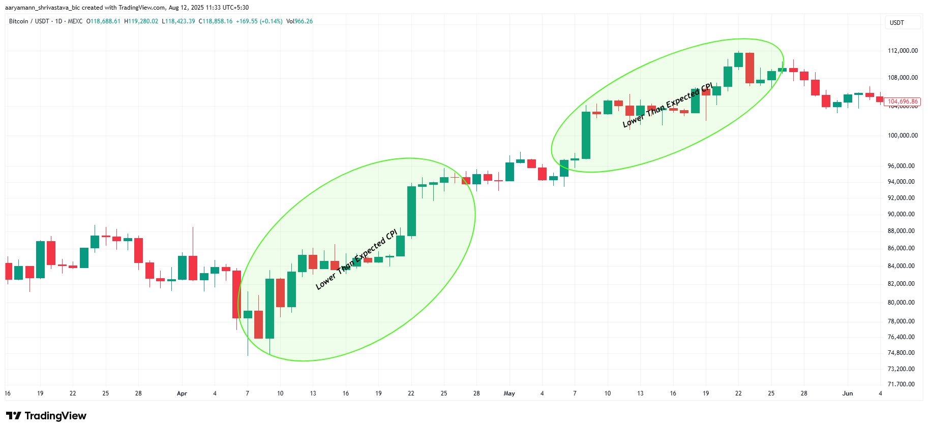 Jadi, jika laporan CPI datang di bawah perkiraan 2,8%, mempertahankan 2,7% YoY saat ini dari Juli, Bitcoin mungkin bisa melewati resistance US$120.000. Laporan CPI yang positif dapat membuka jalan bagi Bitcoin untuk mencapai US$122.000 dan berpotensi memperpanjang reli menuju all-time high (ATH) sebesar US$123.218.