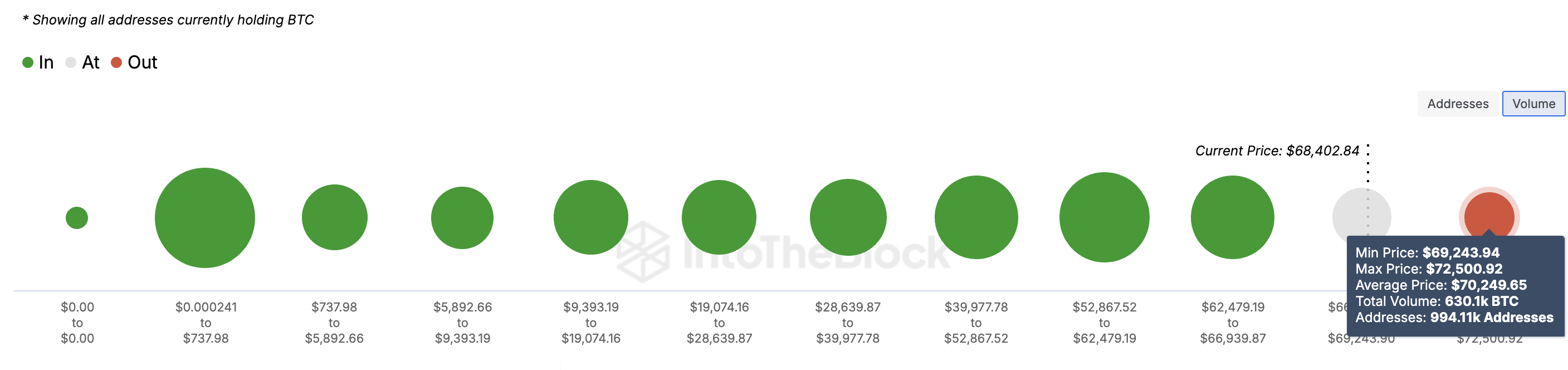 Menurut data Global In/Out of Money (GIOM), BTC berada dalam posisi strategis untuk mencetak kenaikan lebih lanjut. GIOM mengidentifikasi harga rata-rata di mana koin dibeli dan membandingkannya dengan harga saat ini. Jika harga saat ini lebih tinggi dari harga beli, maka alamat-alamat tersebut berada di zona profit.