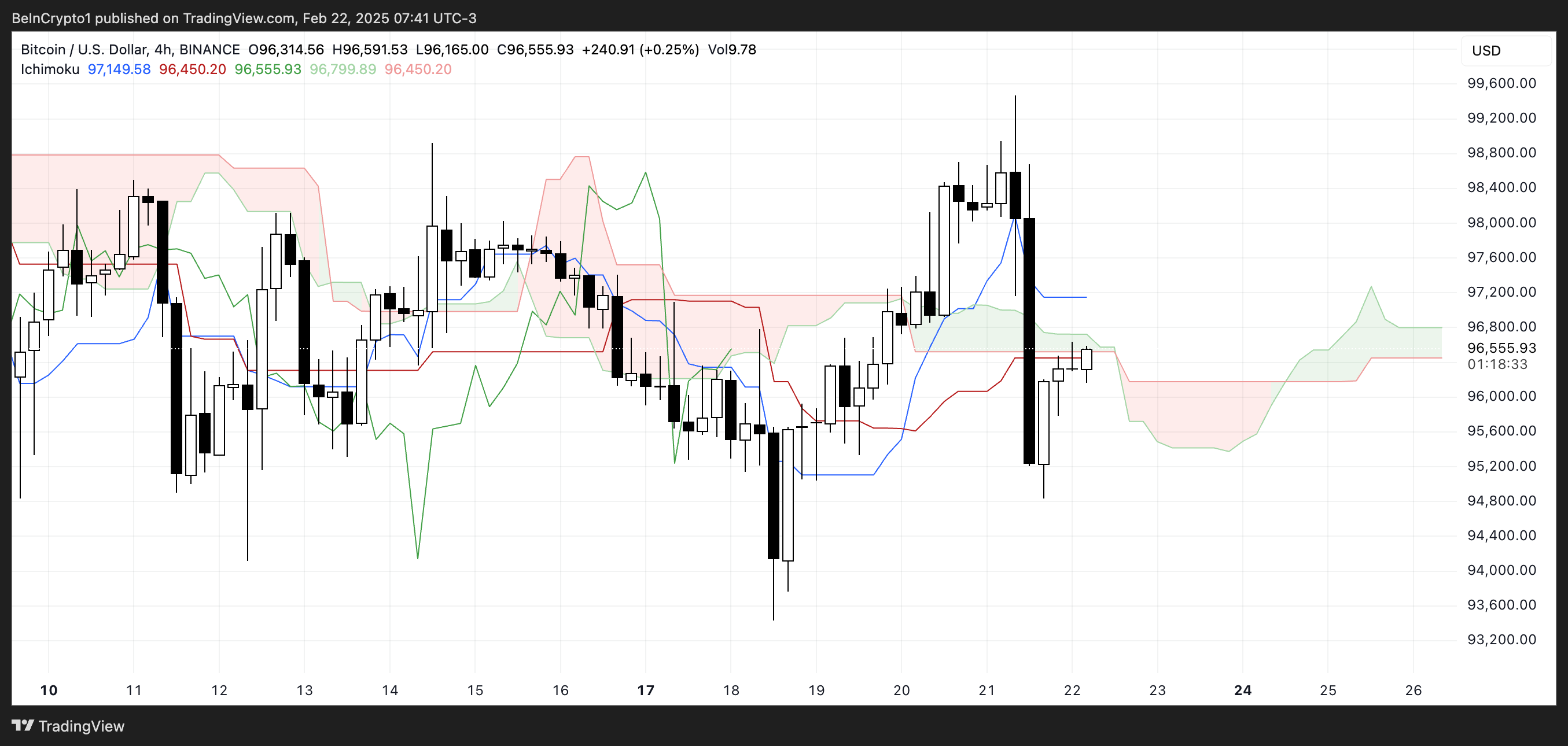 Grafik Ichimoku Cloud untuk Bitcoin menunjukkan prospek campuran dengan tanda-tanda awal potensi pemulihan. Garis Tenkan-sen biru saat ini berada di atas garis Kijun-sen merah.