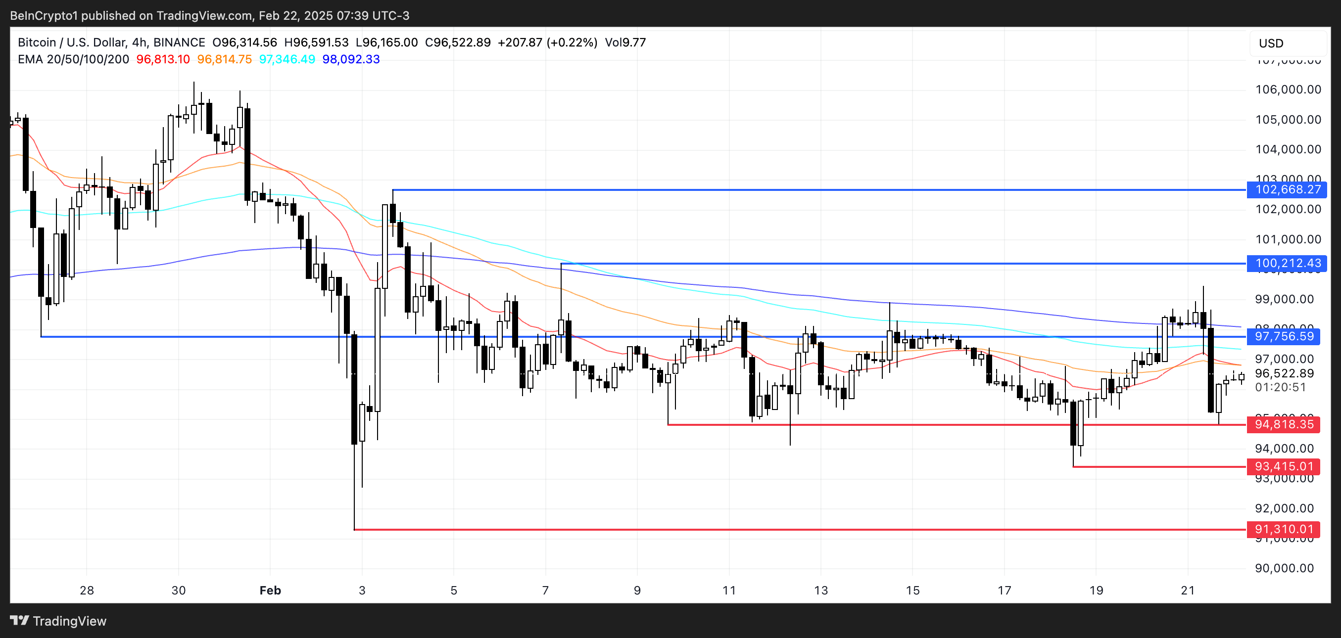 Pengaturan bearish ini menunjukkan bahwa tekanan jual tetap dominan. Jika penjual terus menguasai pasar, Bitcoin bisa retest support di US$94.818, yang dipertahankan selama penurunan kemarin.