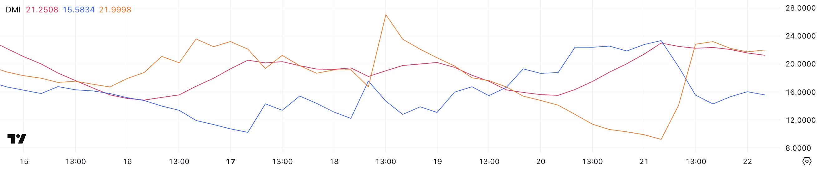 Directional Movement Index (DMI) Bitcoin menunjukkan Average Directional Index (ADX) saat ini di 21,2, setelah sempat menyentuh 22,9, naik dari 15,5 dua hari lalu.