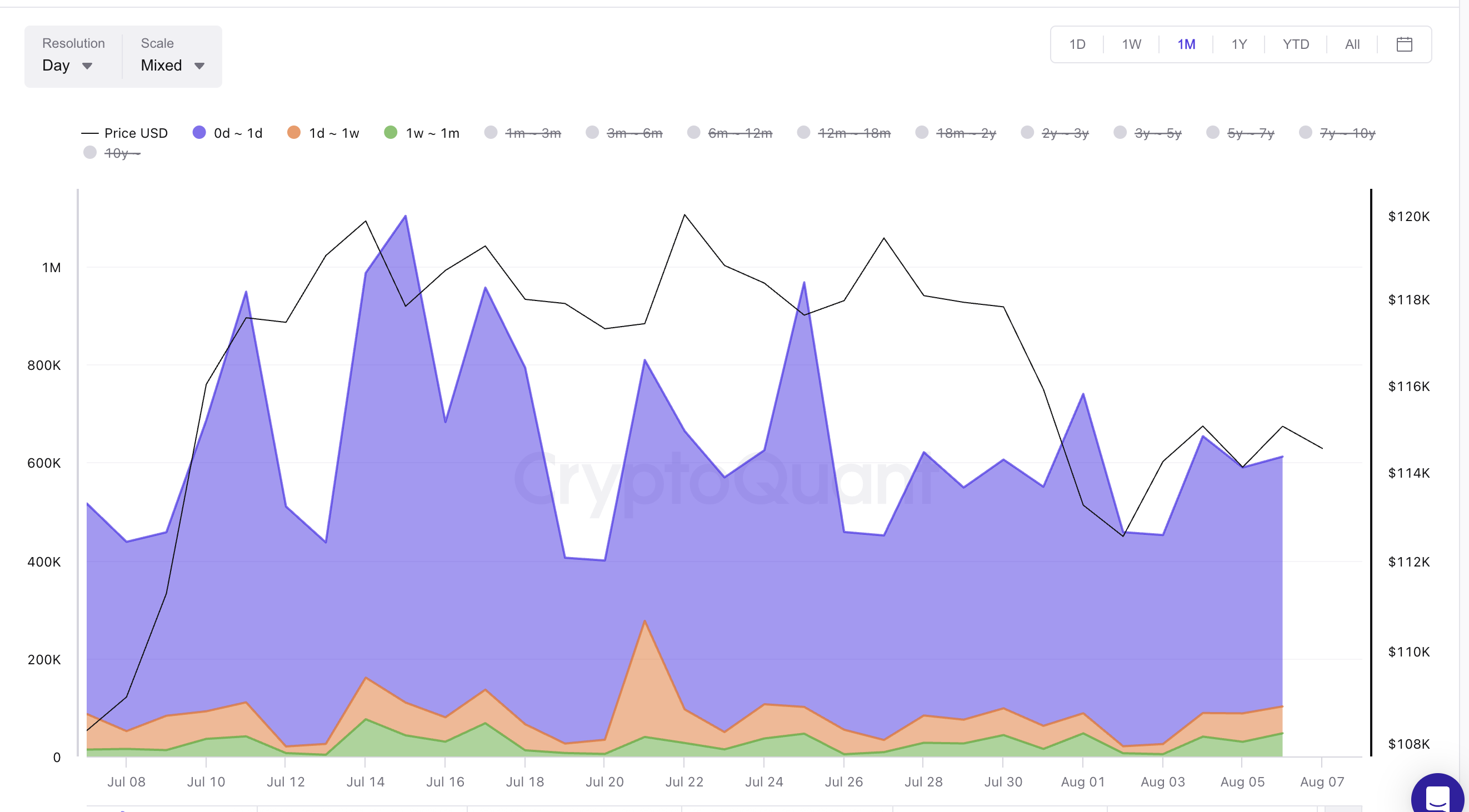 Setiap kali harga Bitcoin menyentuh US$115.000 atau puncak lokal lainnya selama sebulan terakhir, holder jangka pendek, mereka yang membeli BTC dalam beberapa minggu terakhir, mulai menjual. Rentang usia output yang dihabiskan menunjukkan hal ini dengan jelas. Pada 22 Juli, 28 Juli, dan bahkan 6 Agustus, Bitcoin mencoba naik lebih tinggi, tetapi penjualan dari wallet yang memegang BTC kurang dari sebulan meningkat tepat di puncak.