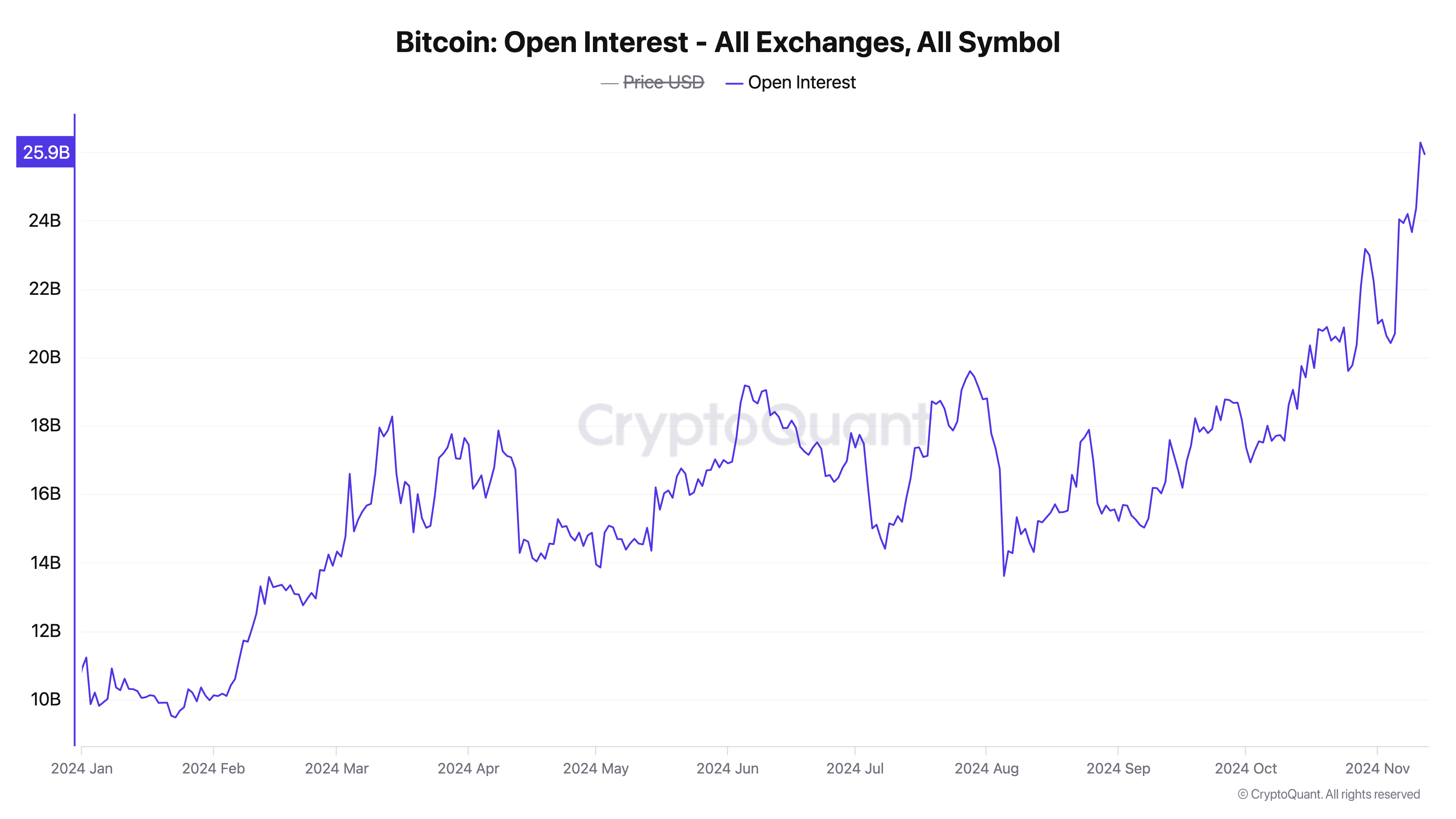 Meledaknya open interest Bitcoin adalah faktor kunci yang mungkin mencegah kenaikannya ke harga US$90.000 dalam jangka pendek. Menurut data dari CryptoQuant, selama minggu lalu, pasar futures telah melihat penambahan lebih dari US$16 miliar dalam posisi terbuka. Ini menandai peningkatan leverage yang signifikan. Pada waktu publikasi, open interest BTC berada di US$25 miliar, tertinggi sejak Agustus 2022.