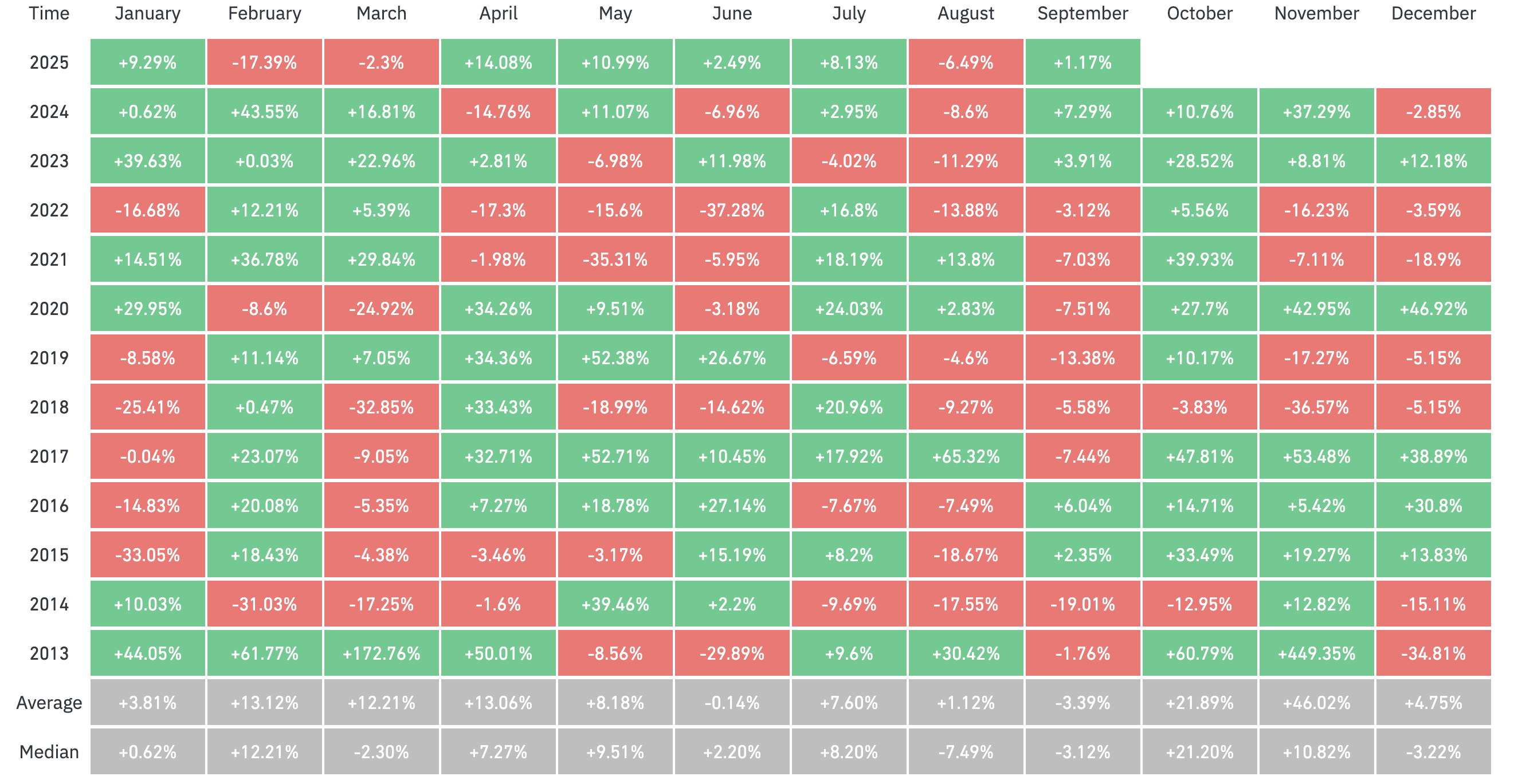 “Jika Anda berinvestasi di BTC pada 1 Oktober, Anda akan mendapatkan keuntungan 12 kali sejak 2009, dengan pengembalian bulanan maksimum 213% pada 2010. Melihat lebih baru sejak 2020, investasi sederhana pada 1 Oktober di BTC akan menghasilkan antara 7,5% dan 30,5% dalam sebulan saja. Setelah ini, sulit untuk berargumen bahwa BTC tidak memiliki musiman sama sekali, meskipun ini juga bisa menjadi bagian dari efek musiman yang lebih luas di pasar keuangan,” tulisnya.