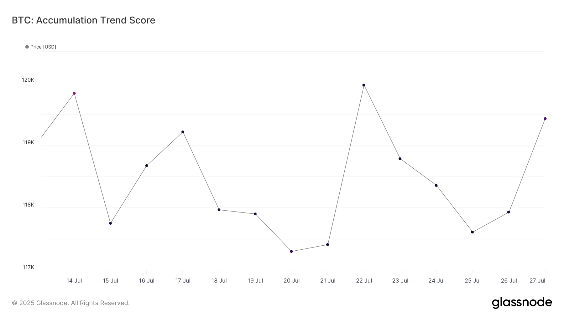 Harga Bitcoin saat ini berada di US$118.938, dalam rentang konsolidasi antara US$117.261 dan US$120.000. Meskipun rentang ini tetap stabil, kemungkinan untuk menembus US$120.000 tinggi jika sentimen investor tetap kuat.