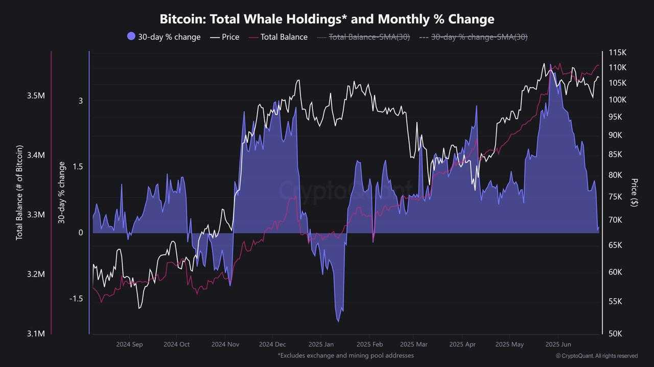 Metrik on-chain dari CryptoQuant mengungkapkan perubahan struktural yang lebih dalam. Perubahan persentase 30 hari dalam total kepemilikan whale kini berubah negatif untuk pertama kalinya dalam enam bulan.