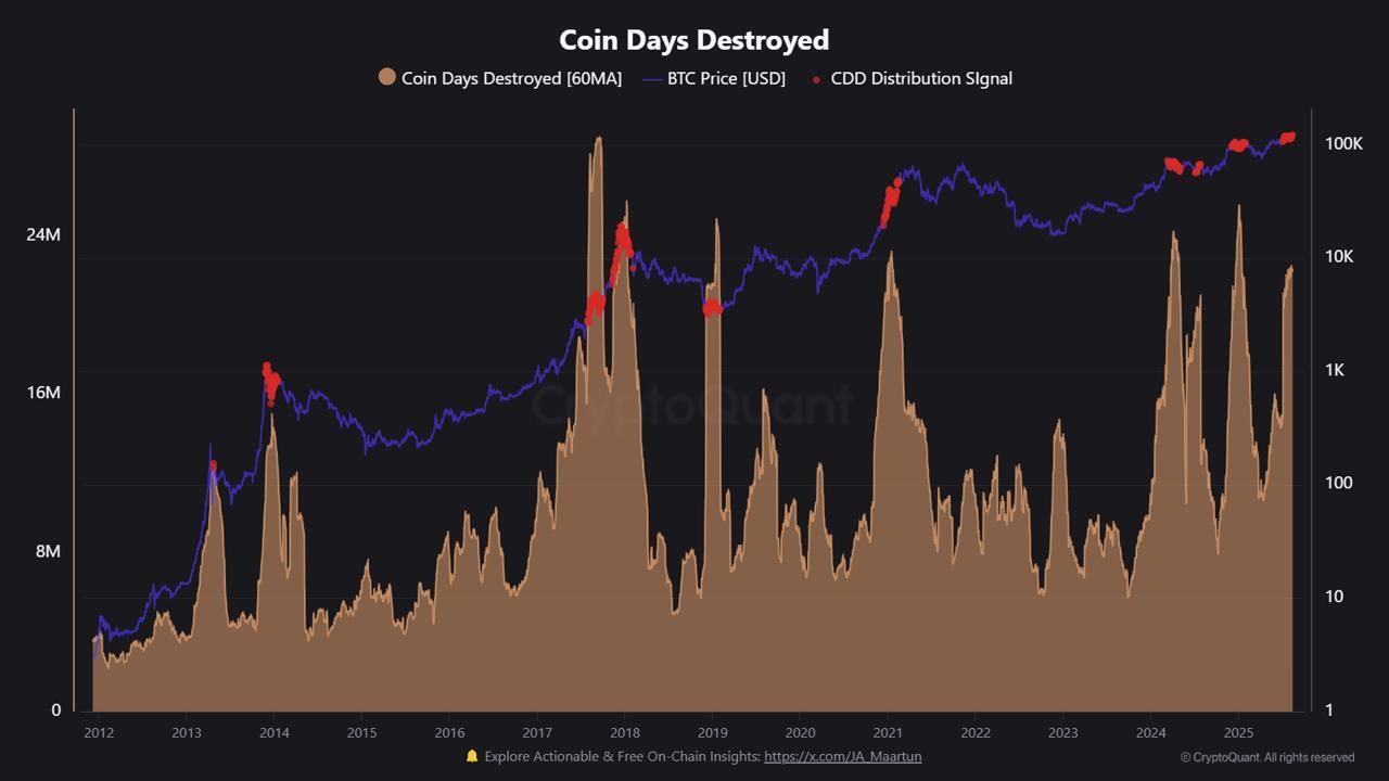 Momentum makro keseluruhan dari Bitcoin juga menunjukkan tanda-tanda kelemahan. Salah satu indikator yang mencolok adalah lonjakan terbaru dalam “Coin Days Destroyed,” metrik yang digunakan untuk melacak pergerakan holder jangka panjang (LTH). Menurut data CryptoQuant, ini adalah lonjakan besar kedua dalam metrik tahun ini, menandakan peningkatan aktivitas penjualan di antara LTH.