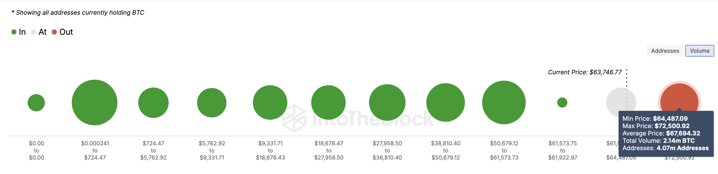 Berdasarkan data dari IntoTheBlock, potensi kenaikan Bitcoin ke US$68,000 dapat menghasilkan keuntungan yang belum pernah terlihat sebelumnya. Menggunakan Global In/Out of Money (GIOM), BeInCrypto mengamati bahwa lebih dari 4 juta alamat yang memegang 2,14 juta BTC dengan harga rata-rata US$67,694 sedang dalam posisi rugi.