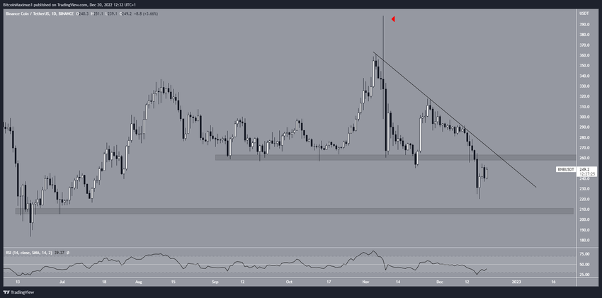 BNB telah menurun di bawah garis descending resistance sejak mencapai titik tertingginya di US$398,30 pada 3 November lalu. Di hari yang sama, koin ini menciptakan sebuah sumbu atas yang panjang (simbol merah). Penurunan tersebut mengakibatkannya menyentuh titik terendah hingga US$220 pada 17 Desember. Kemudian, BNB juga mengalami breakdown dari area support horizontal US$260.