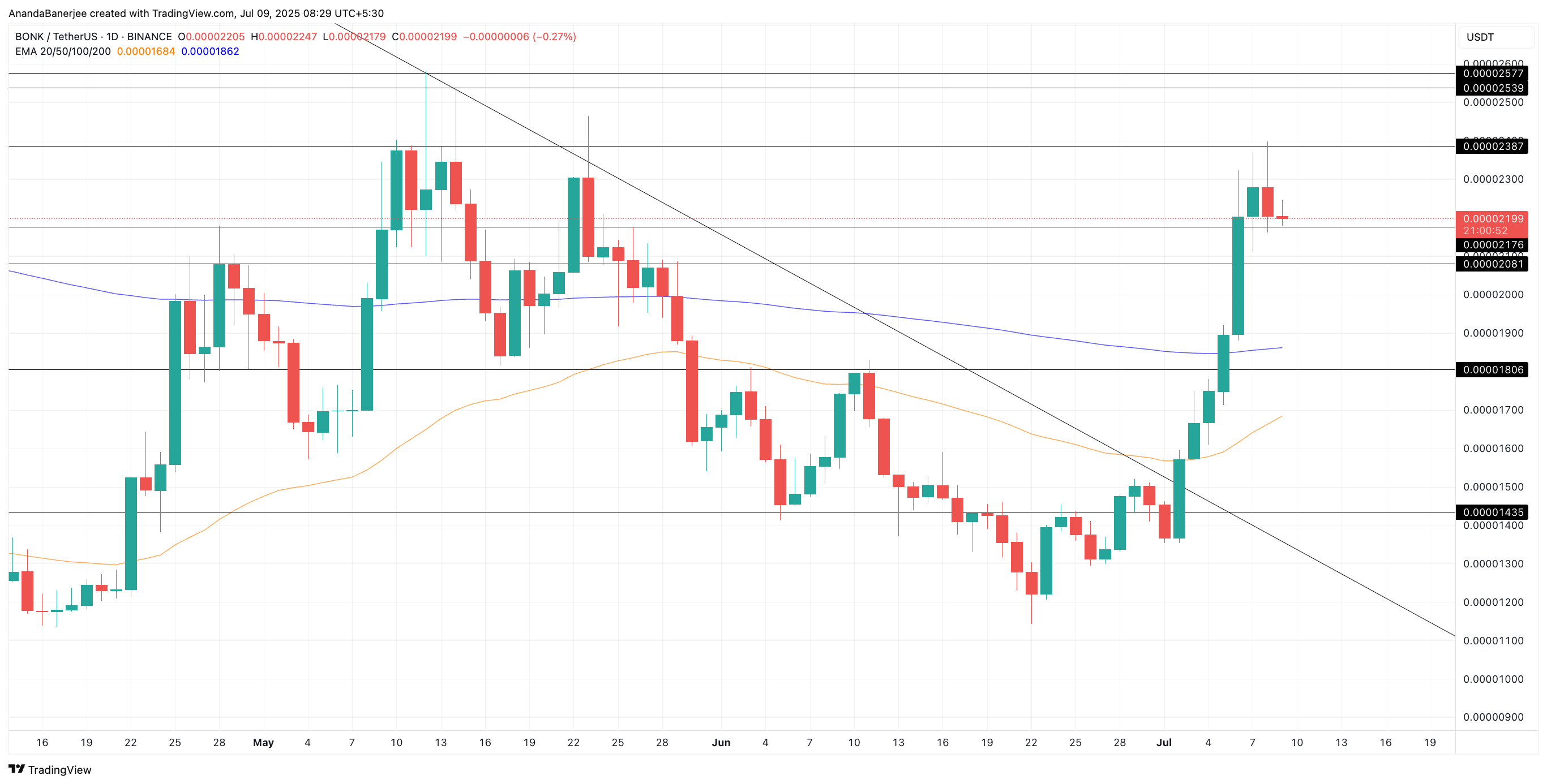 Jika BONK turun di bawah US$0,00001806, momentum breakout akan hilang. Penurunan di bawah US$0,00001435 akan mengonfirmasi pembalikan yang gagal, meragukan pola wedge.