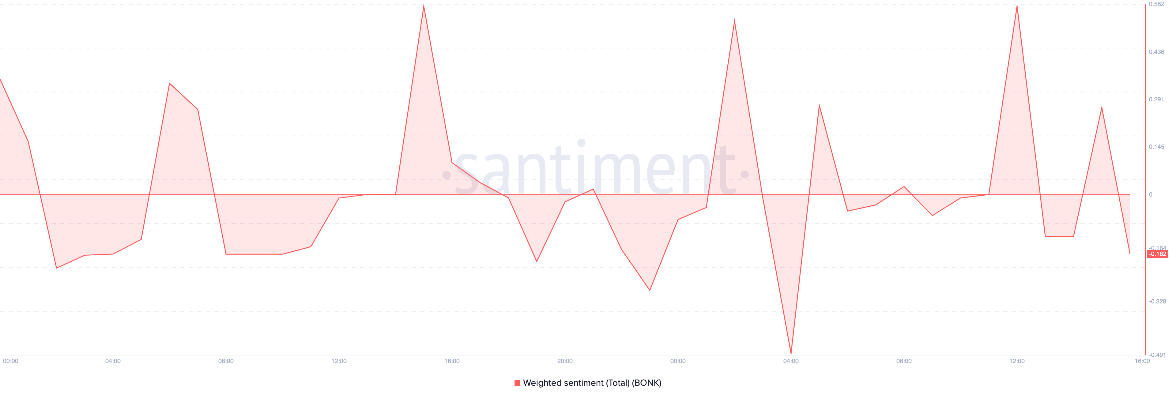 Di luar volume, Sentimen Tertimbang adalah metrik lain yang menunjukkan bahwa BONK mungkin kesulitan untuk terus menghargai.