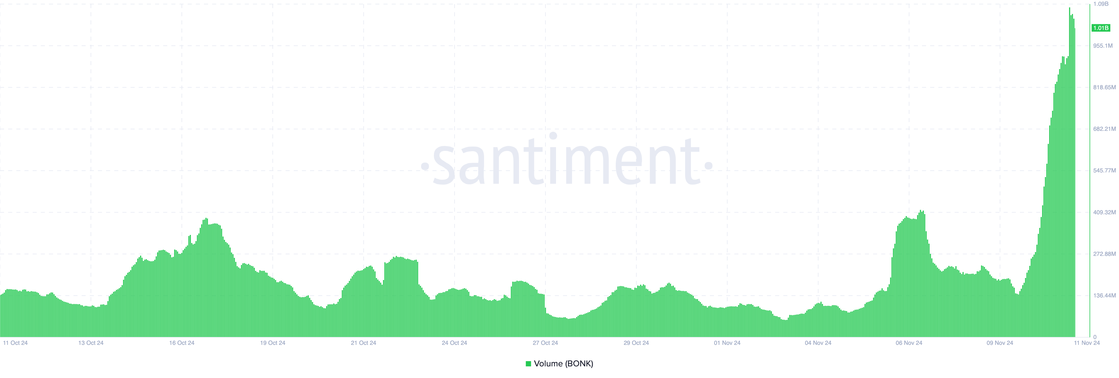 Data dari platform analitik on-chain Santiment menunjukkan bahwa volume Bonk adalah sekitar US$125 juta pada 9 November. Volume perdagangan adalah metrik kunci dalam kripto, mencerminkan popularitas sebuah koin dan memberikan petunjuk arah harga potensial.