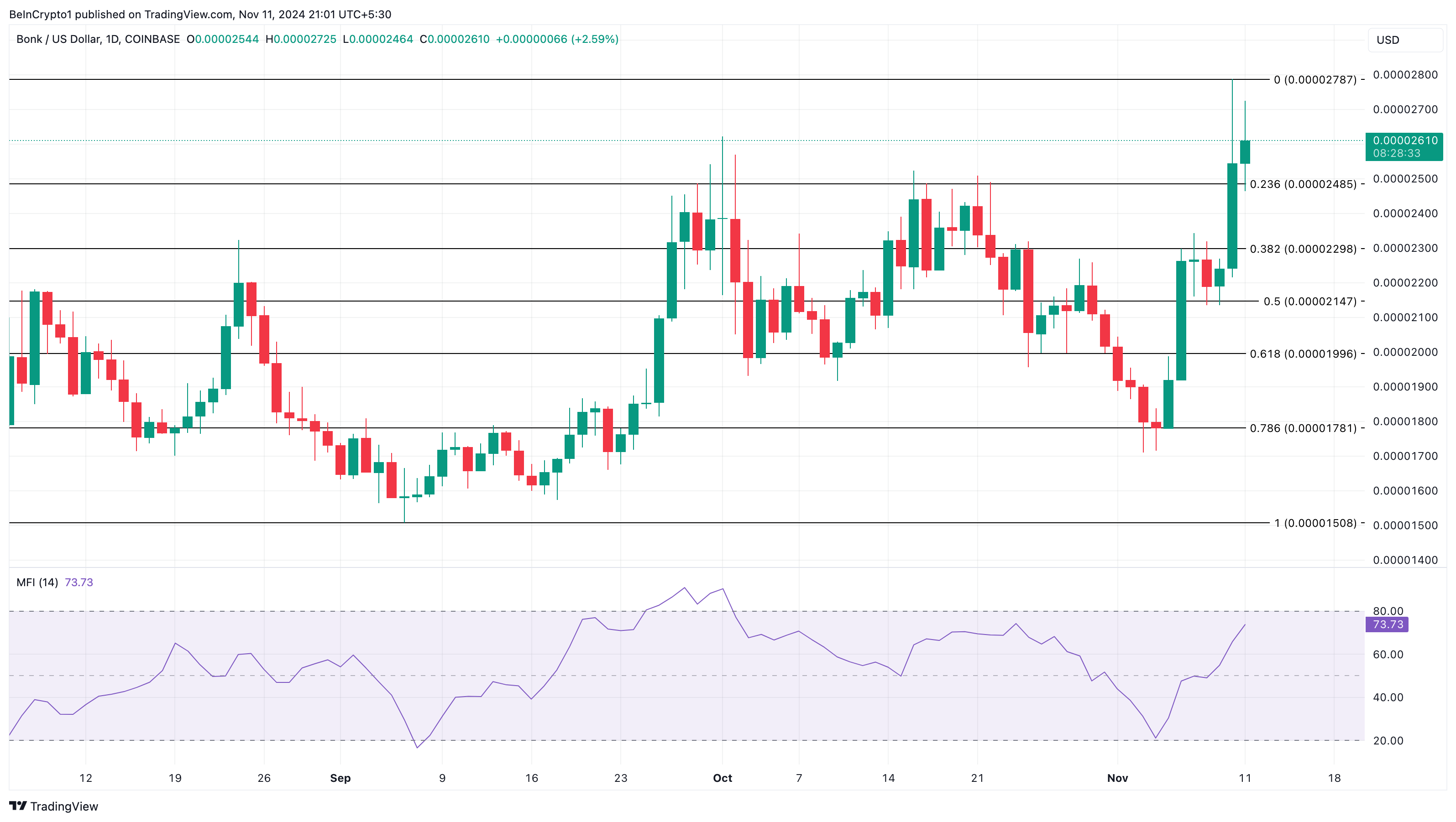 Pada grafik harian, harga Bonk terus menunjukkan tanda-tanda bahwa itu bisa bergerak lebih tinggi. Ini juga didukung oleh kenaikan pembacaan Indeks Aliran Uang (MFI).