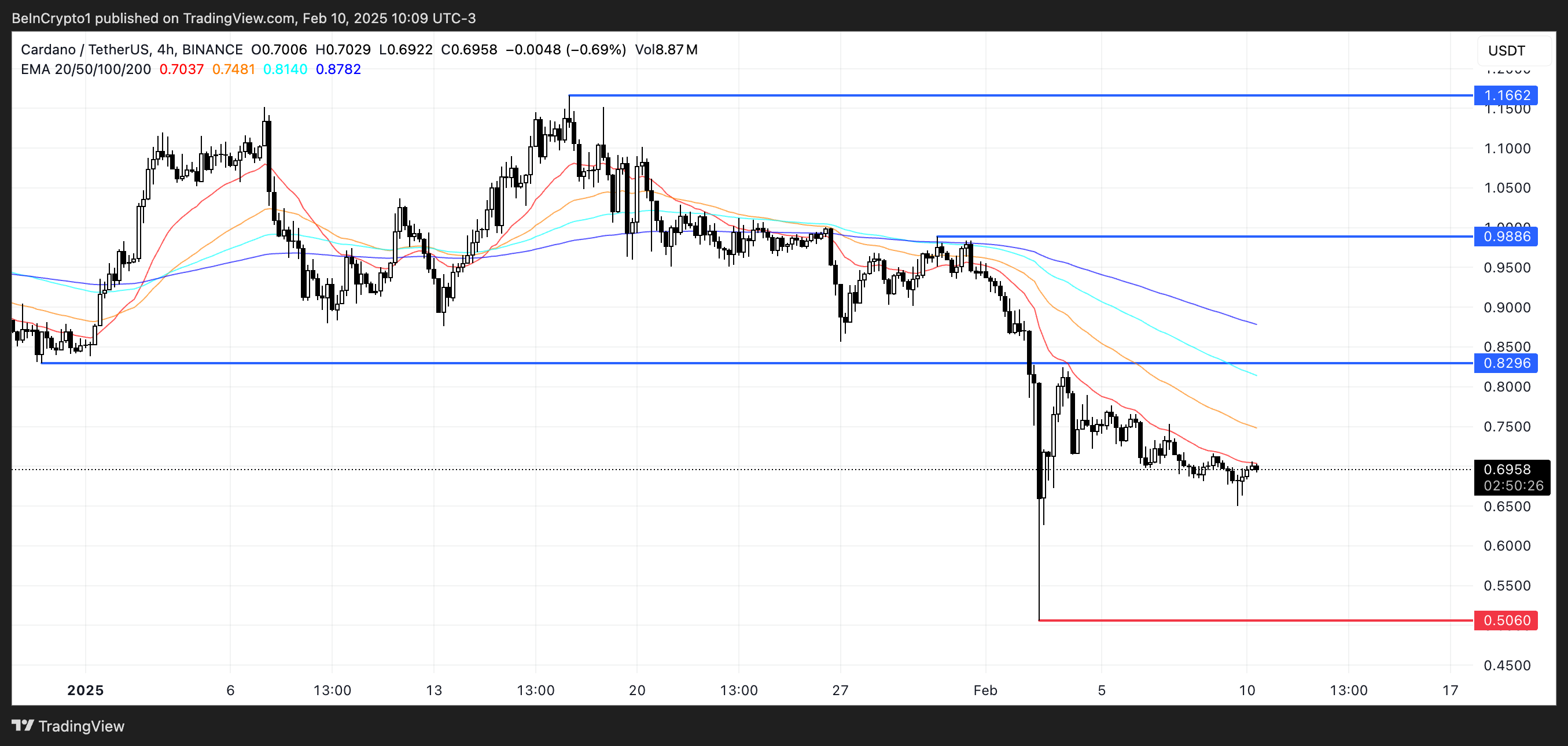Garis EMA Cardano (ADA) terus menunjukkan tren turun, dengan rata-rata bergerak jangka pendek berada di bawah rata-rata jangka panjang. Pengaturan bearish ini menunjukkan bahwa kecuali momentum berubah, harga Cardano bisa memperpanjang penurunannya menuju US$0,50.