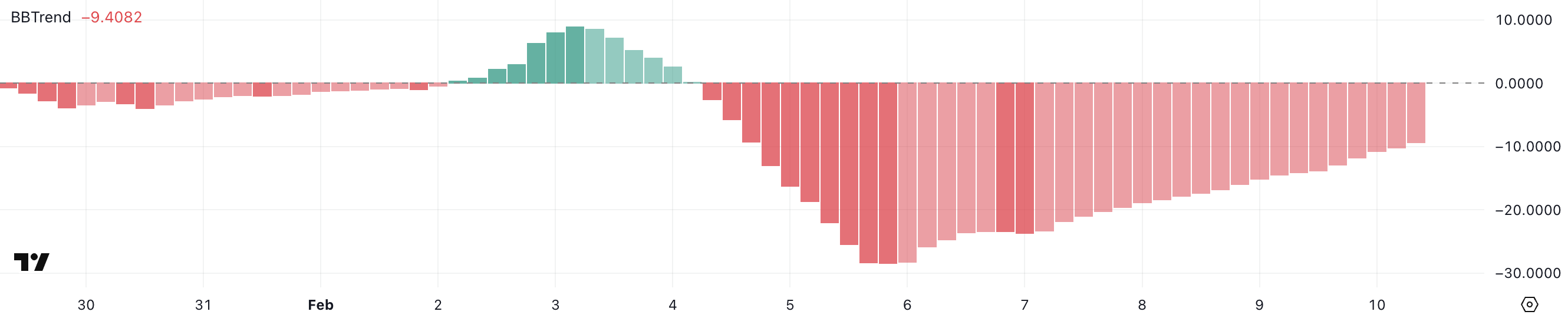 BBTrend, atau Bollinger Band Trend, mengukur kekuatan dan arah tren menggunakan Bollinger Bands. Nilai di bawah nol menunjukkan kondisi bearish, sementara nilai positif menunjukkan momentum bullish.