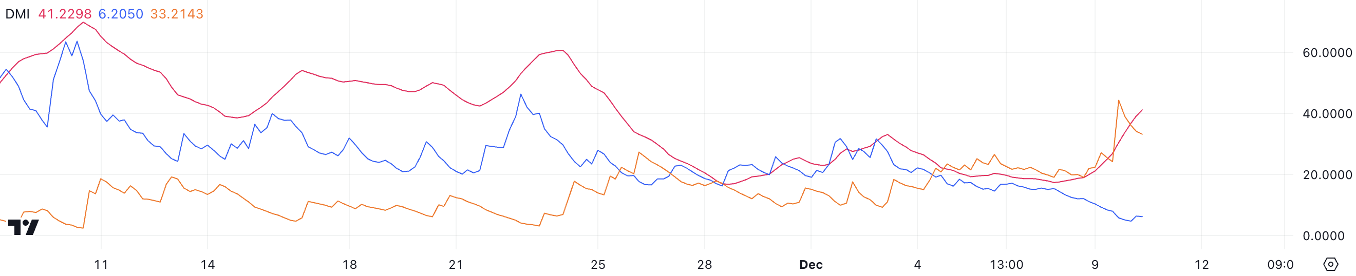Cardano ADX telah naik ke 41,2, dari sekitar 19 dua hari lalu, menunjukkan bahwa tren semakin kuat. Namun, ADA tetap dalam tren penurunan, dengan D- di 33,2 dan D+ di 6,2.