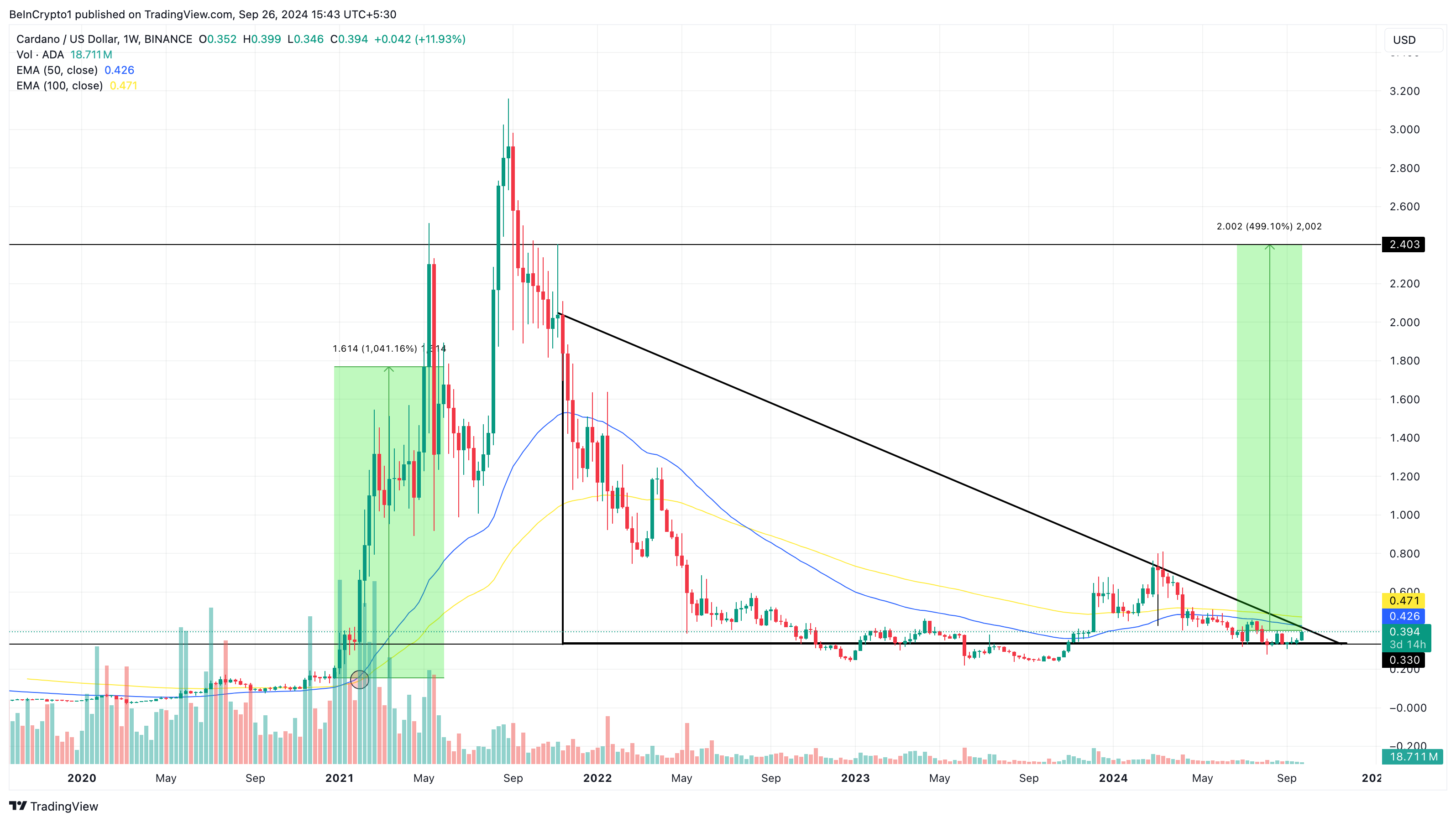 Pada Februari 2021, EMA 50 hari Cardano melintasi di atas EMA 100 hari, menandakan awal dari kenaikan yang substansial. Menariknya, harga Cardano saat ini sebesar US$0,39 dan penyelarasan EMA-nya tampaknya mencerminkan pengaturan sebelum kenaikan bull sebelumnya, menunjukkan bahwa breakout dari segitiga menurun bisa ada di cakrawala.