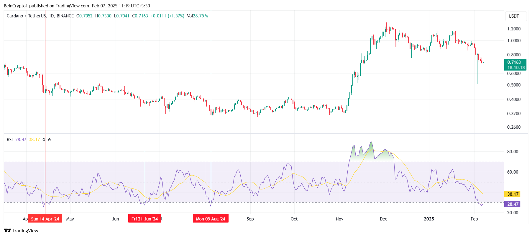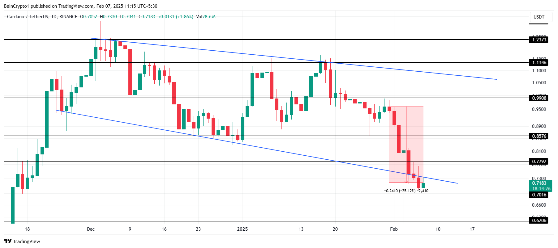 Harga Cardano sudah terkapar 25% dalam sepekan terakhir dan kini diperdagangkan di US$0,71. Aset ini menemukan support di US$0,70, yang untuk sementara berhasil menahan penurunan lebih lanjut. Sayangnya, minimnya momentum bullish yang kuat menimbulkan kekhawatiran mengenai kemampuan ADA untuk pulih dalam waktu dekat.