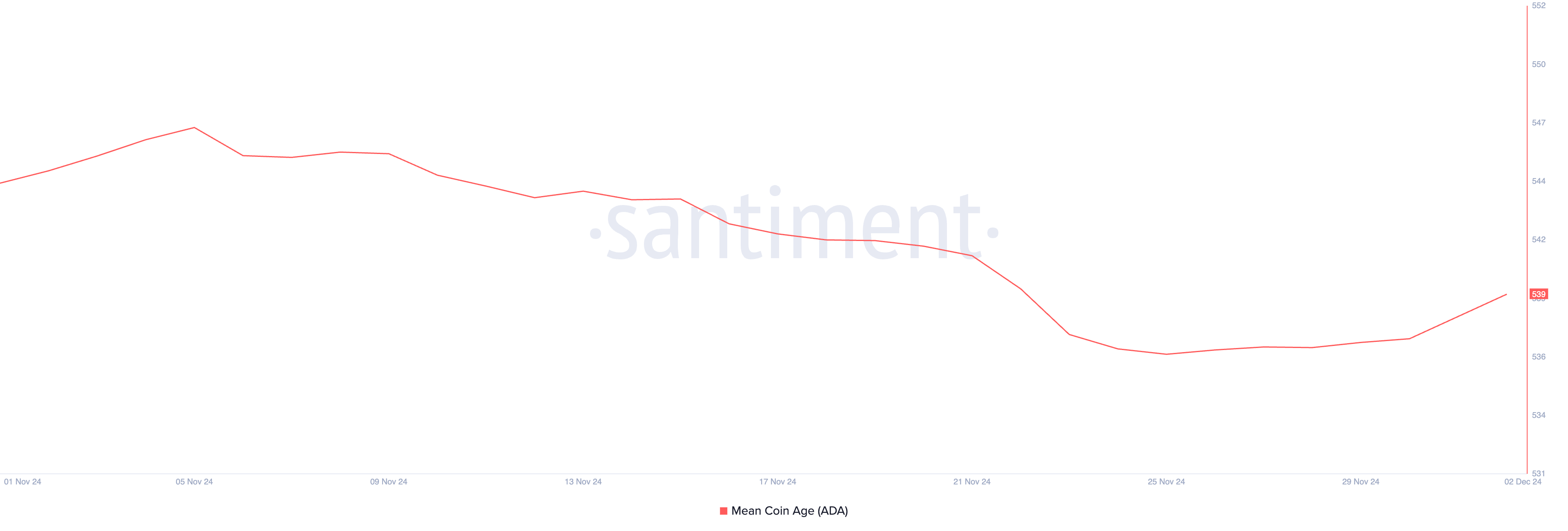 Lonjakan harga Cardano sebesar 217% di November berhasil memicu pergerakan token yang sebelumnya tidak aktif. Kondisi ini seperti yang tecermin dari menukiknya nilai Mean Coin Age-nya dalam periode 30 hari.