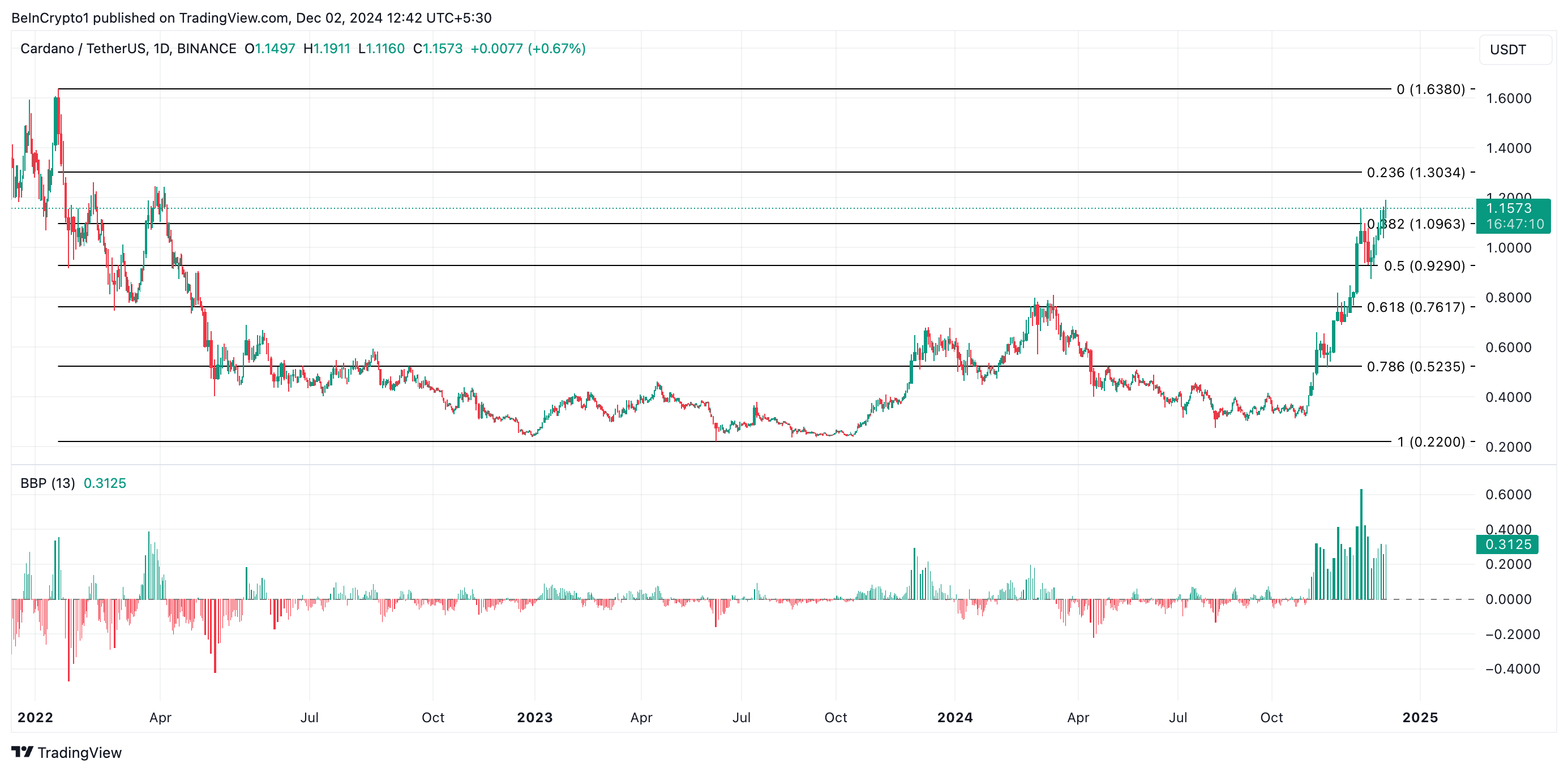 Pada grafik harian, Elder-Ray Index Cardano mengonfirmasi bias atau kecenderungan bullish pada altcoin ini. Saat publikasi, nilai indikator ini adalah 0,31.