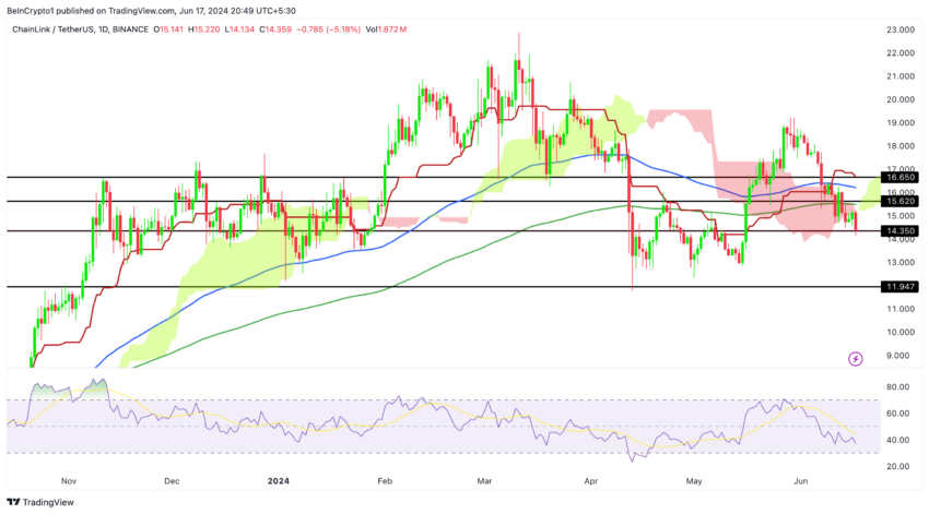 Dalam analisis sebelumnya yang terbit pada 10 Juni 2024, LINK bertengger di harga US$16. Pada saat itu, BeInCrypto meramal penurunan harga yang signifikan, yang sejak itu telah terkonfirmasi. Chainlink menerobos level support penting di US$15,60. Akibatnya, LINK melanjutkan tren turun hingga menyentuh level support kritis US$14,30.