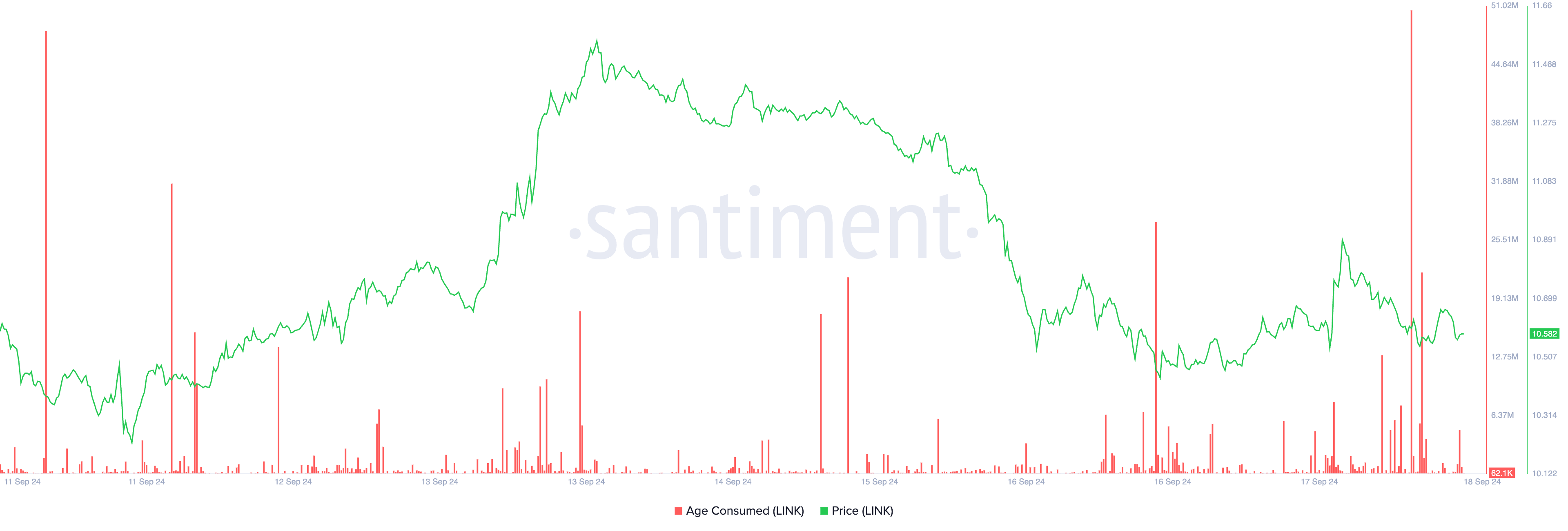 Data on-chain menunjukkan bahwa usia konsumsi LINK, yang melacak pergerakan token yang telah lama dipegang, naik ke puncak tujuh hari sebesar 50,51 juta pada Rabu pagi. Lonjakan ini penting karena pemegang jangka panjang jarang memindahkan koin mereka. Ketika mereka melakukannya, sering kali mendahului perubahan tren pasar.