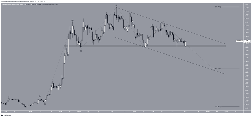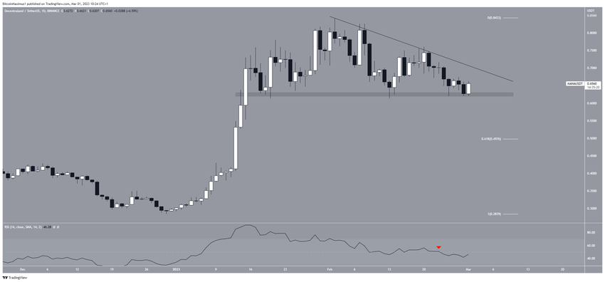 Harga Decentraland terpantau telah anjlok di bawah garis descending resistance sejak berhasil mencapai harga tertinggi tahunannya di level US$0,842 pada 2 Februari. Selama aksi turun berlangsung, harganya sudah berkisar di atas area support horizontal jangka panjang US$0,625. Gabungan antara kedua struktur ini kemudian menciptakan pola descending triangle yang dianggap sebagai pola bearish. Oleh sebab itu, harganya diperkirakan bakal mengalami breakdown dari area tersebut.