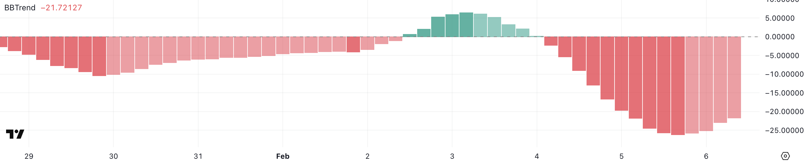 BBTrend merupakan indikator yang mengukur kekuatan tren berdasarkan Bollinger Bands. Nilai positif menunjukkan momentum bullish dan nilai negatif menunjukkan tren bearish. Semakin jauh nilai dari nol, semakin kuat tren ke arah mana pun.