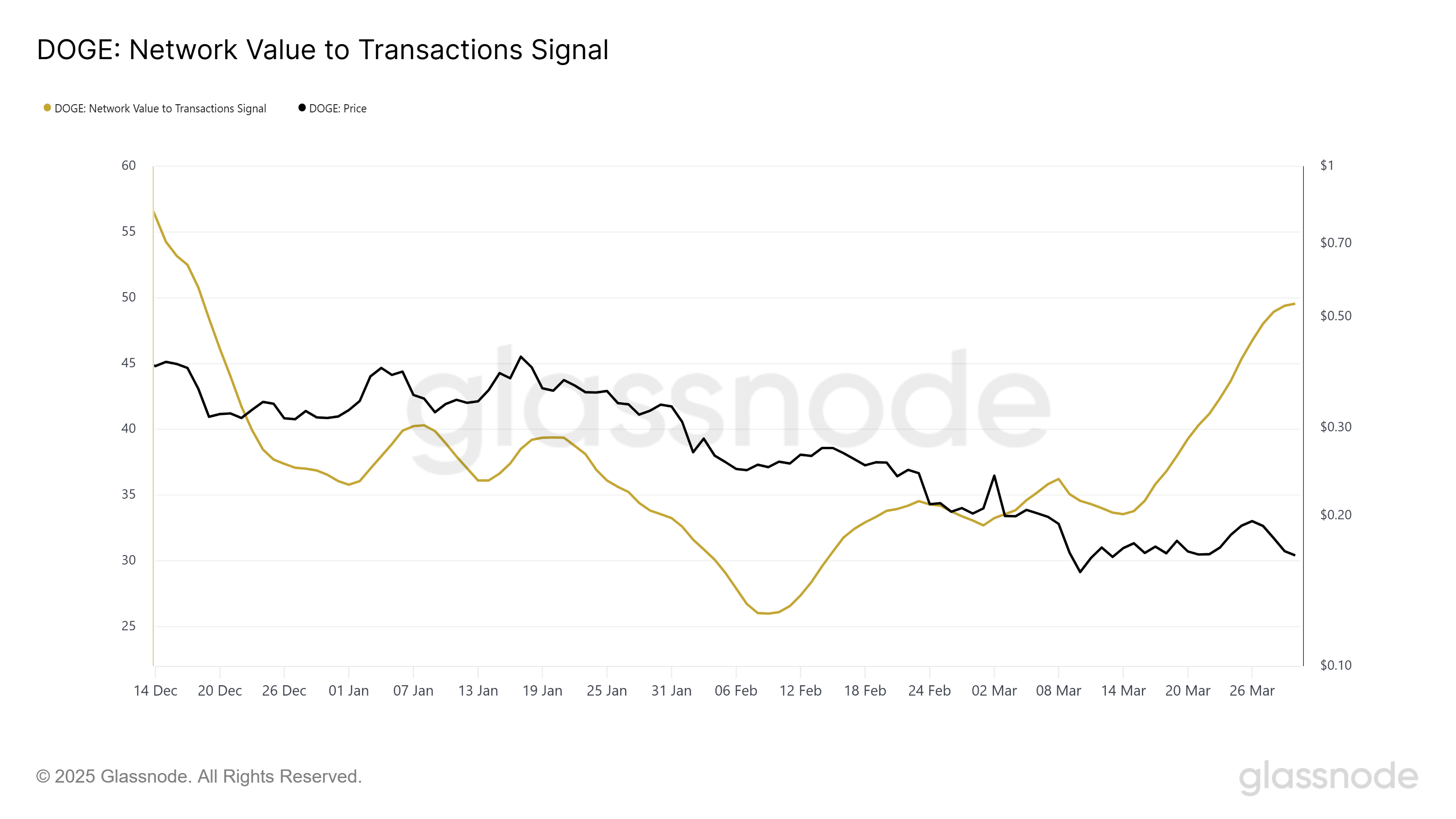 Rasio Network Value to Transaction (NVT) Dogecoin melonjak signifikan, mencapai titik tertinggi dalam tiga bulan. Ini menunjukkan bahwa nilai jaringan tidak sebanding dengan jumlah transaksi, menandakan kemungkinan kurangnya kepercayaan investor.