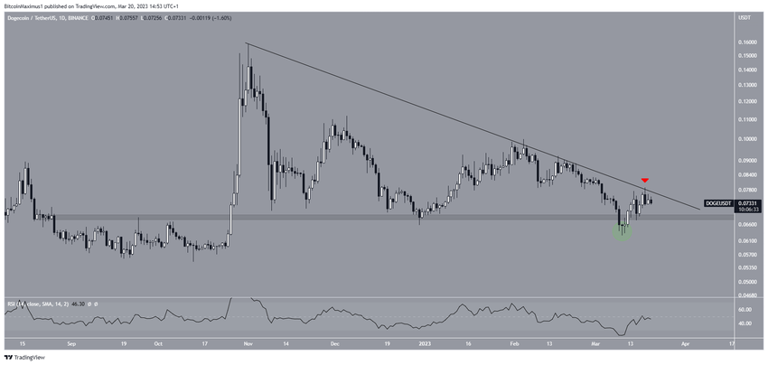 Analisis teknikal dari time frame harian memberikan pandangan yang sama-sama tidak pasti. Harga DOGE telah turun di bawah garis descending resistance jangka pendek sejak bulan November 2022. Baru-baru ini, garis ini menyebabkan penolakan pada 14 Februari, tepatnya pada harga tertinggi tahun ini, dan pada 18 Maret (ikon merah). Sehingga, hal tersebut menciptakan bearish engulfing candlestick dan memulai pergerakan yang mengarah ke bawah saat ini. Hal ini juga bertepatan dengan indikator RSI yang mengalami penolakan dari garis 50.