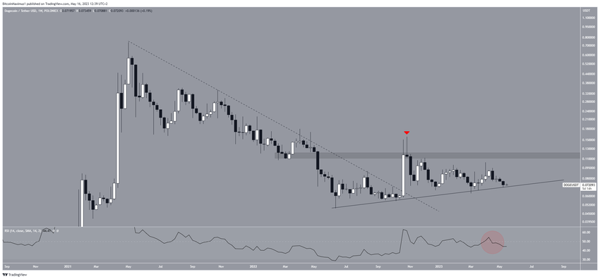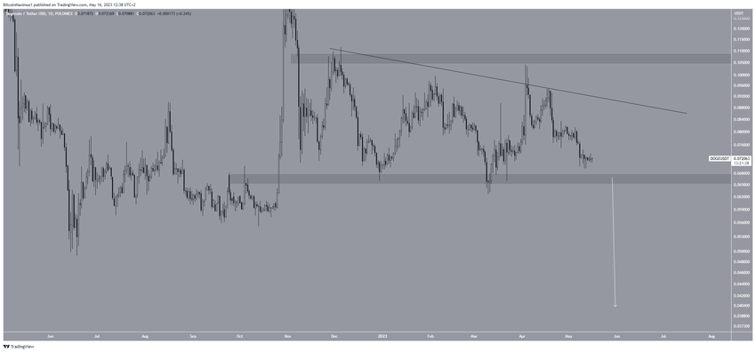 Aksi harganya menunjukkan bahwa harga DOGE telah diperdagangkan di dalam pola descending triangle sejak bulan November 2022 lalu. Pola itu sendiri dianggap sebagai pola bearish, yang berarti biasanya mengarah pada aksi breakdown.