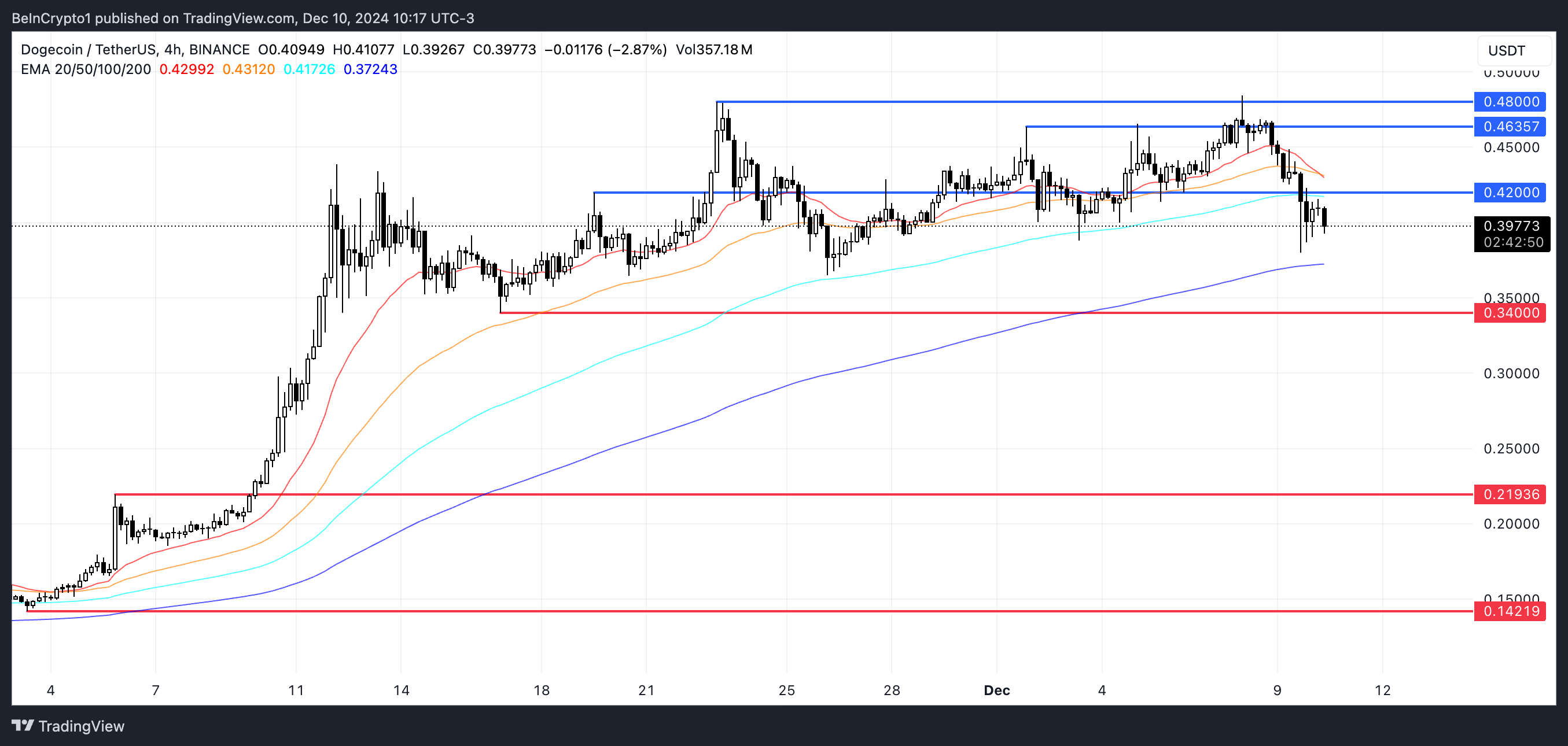 Garis EMA untuk harga Dogecoin jelas menunjukkan bahwa aset kripto ini sedang dalam tren penurunan, dengan garis jangka pendek melintasi di bawah garis jangka panjang. Jika tren bearish ini berlanjut, harga DOGE bisa menguji support terdekat di US$0,34.
