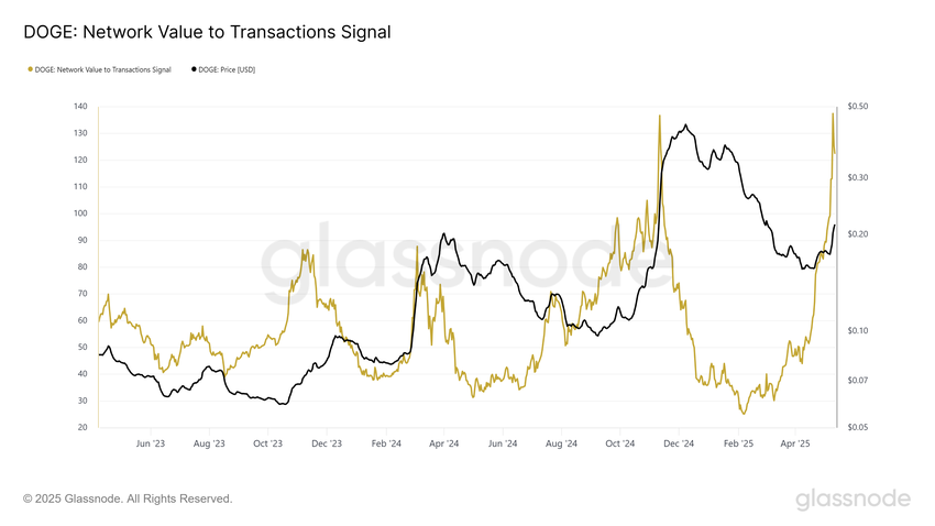 Rasio Network Value to Transactions (NVT) saat ini untuk Dogecoin lebih tinggi dibandingkan saat bull run November 2024. Rasio NVT yang tinggi menandakan bahwa valuasi jaringan melebihi aktivitas transaksionalnya. Ini menunjukkan bahwa emosi spekulatif lebih mendorong reli terbaru daripada fundamental yang kuat.