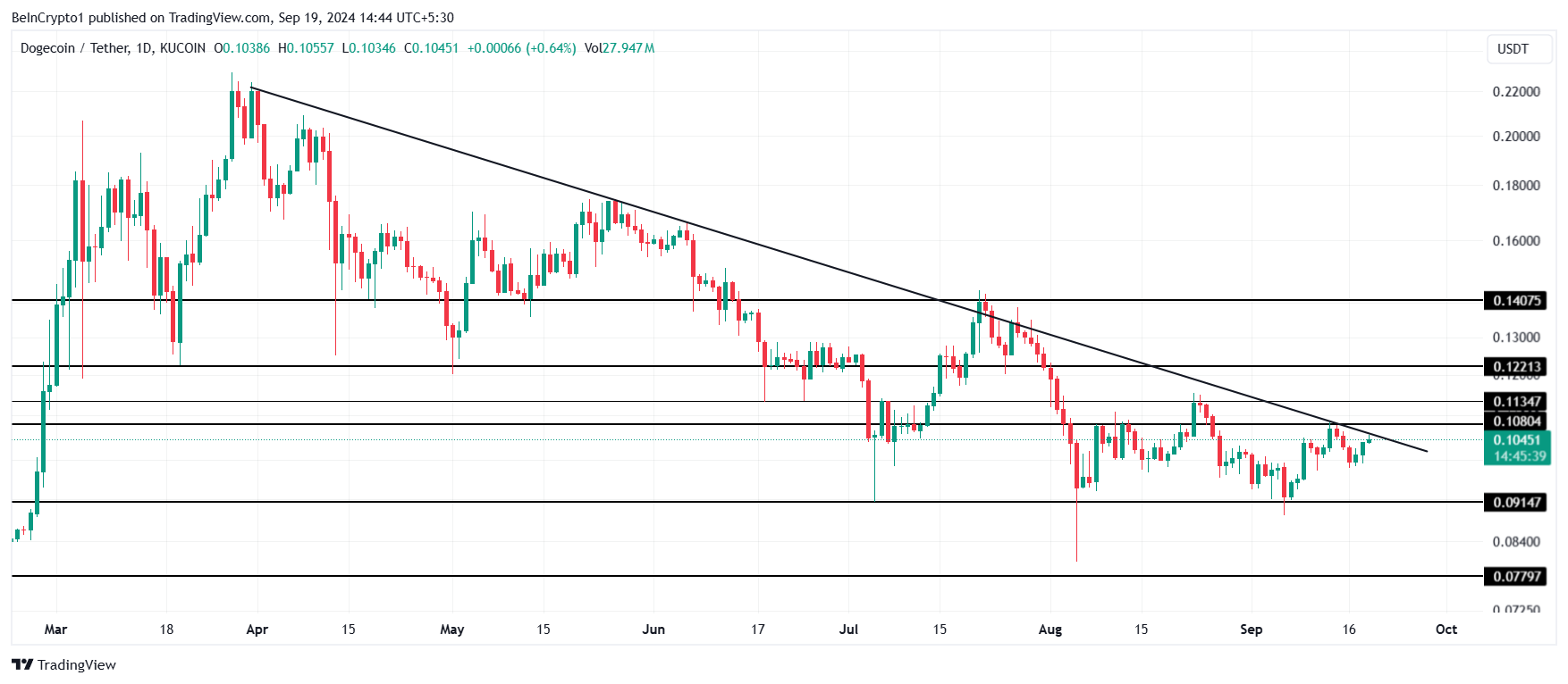 Harga Dogecoin saat ini diperdagangkan sekitar US$0,104 dan menghadapi tantangan ganda untuk keluar dari tren menurun lima bulan sambil juga mengatasi resistensi pada US$0,108. Mengingat isyarat pasar yang lebih luas, prestasi ini mungkin tidak dapat dicapai dalam jangka pendek.