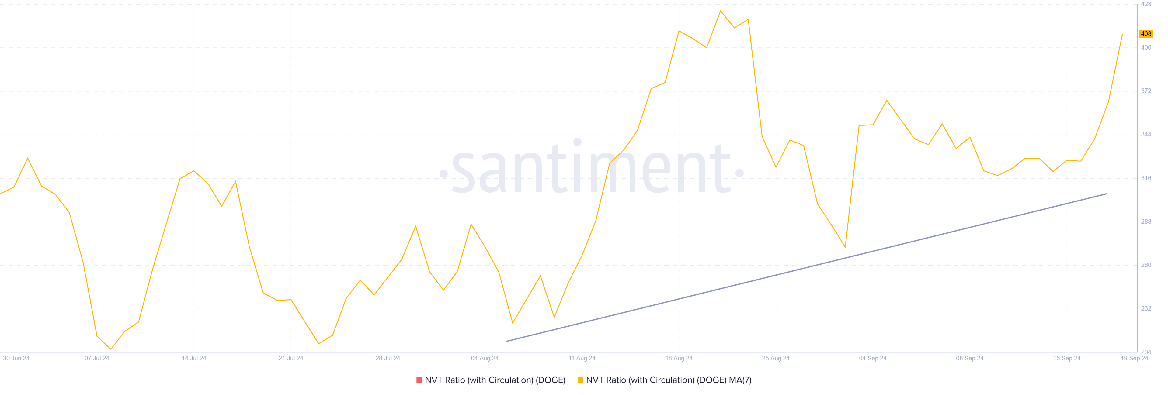 Selain itu, rasio Nilai Jaringan ke Transaksi (NVT), yang telah meningkat sejak awal Agustus, menunjukkan bahwa Dogecoin mungkin dinilai terlalu tinggi. Indikator ini membandingkan kapitalisasi pasar suatu aset dengan volume transaksinya, dan rasio yang meningkat menunjukkan bahwa penilaian melampaui aktivitas jaringan.