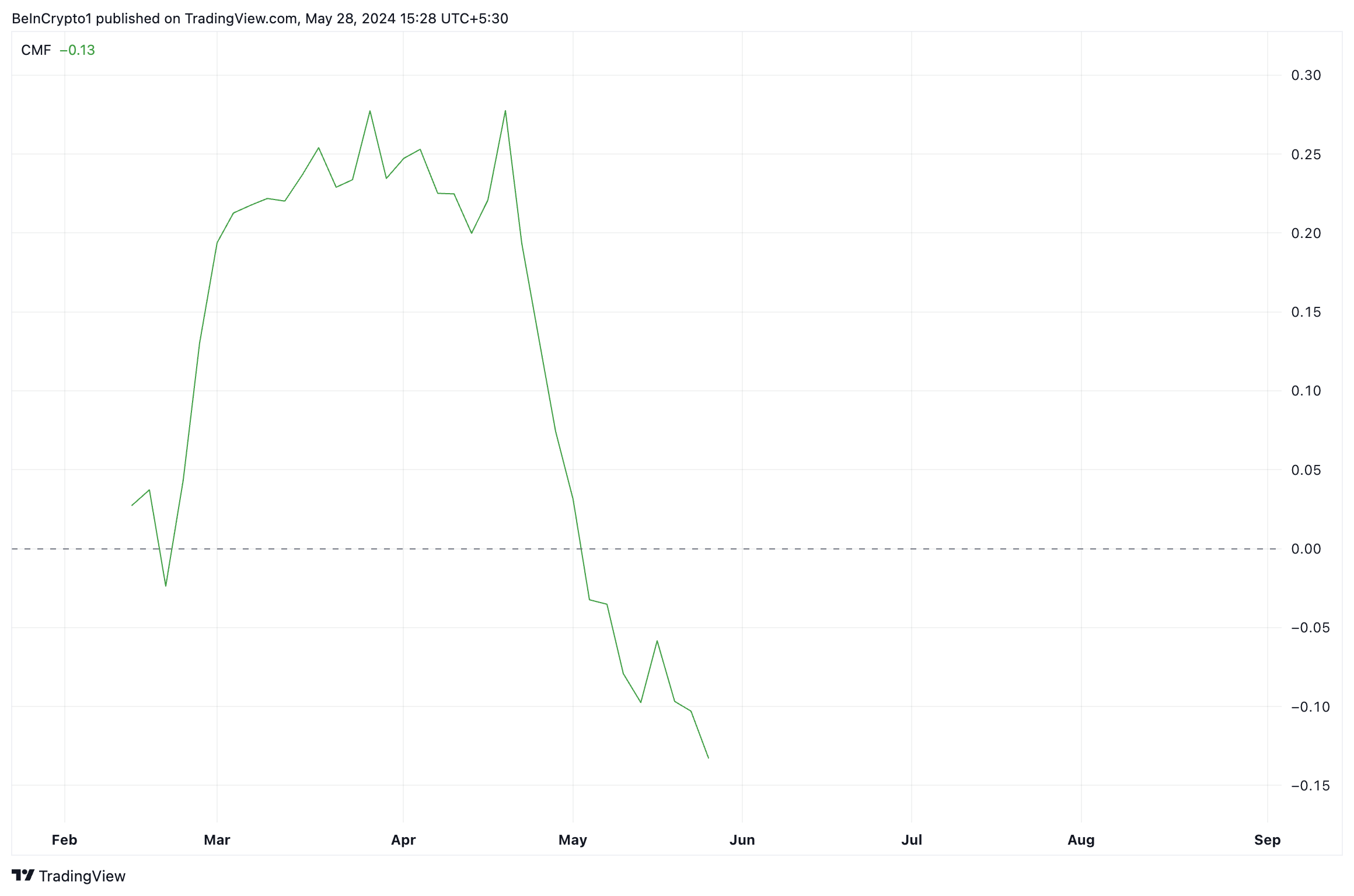 Meskipun harga token ini melonjak minggu lalu, Chaikin Money Flow (CMF) cenderung menukik, alhasil melahirkan pola bearish divergence. Indikator ini mengukur arus masuk dan keluar uang dari pasar WIF.